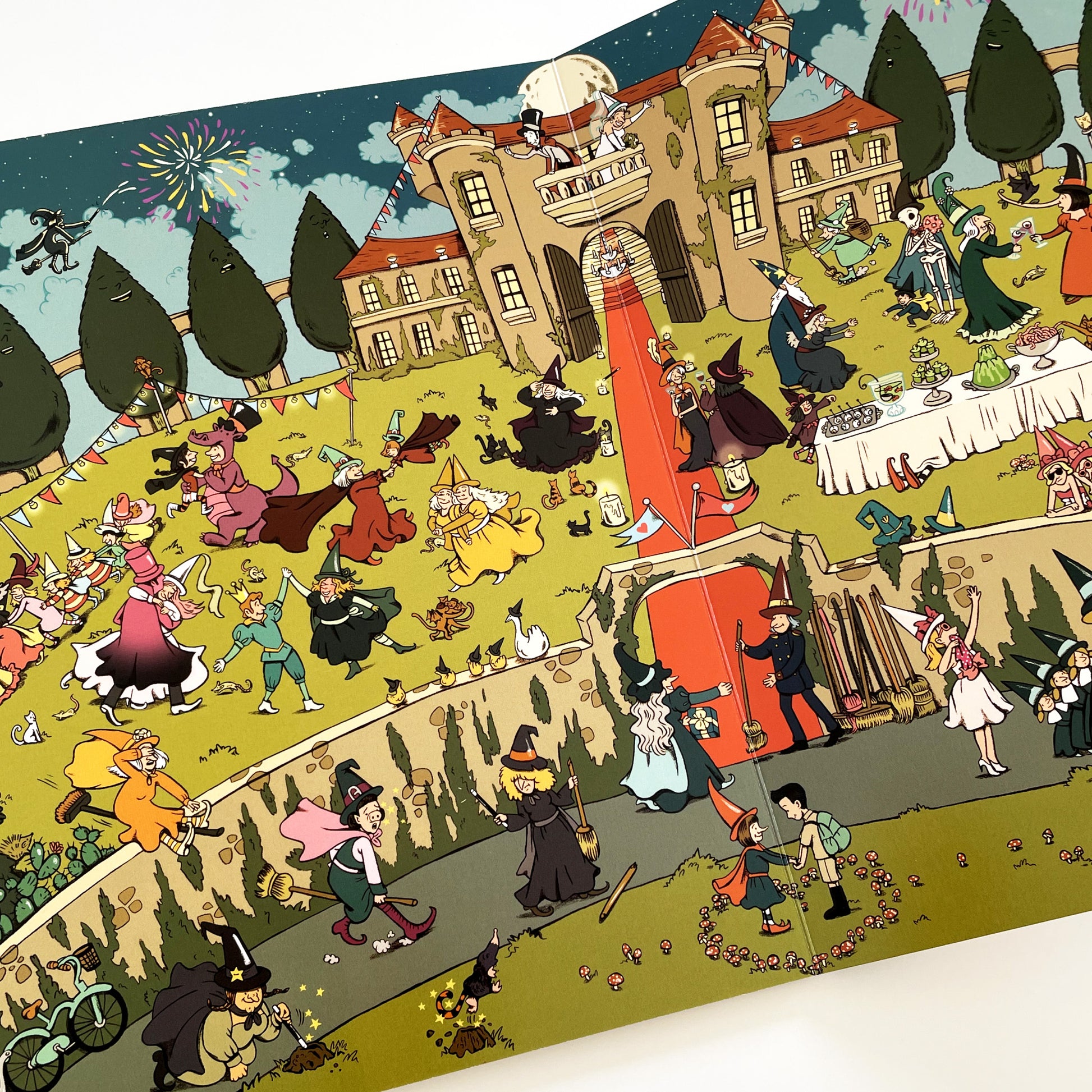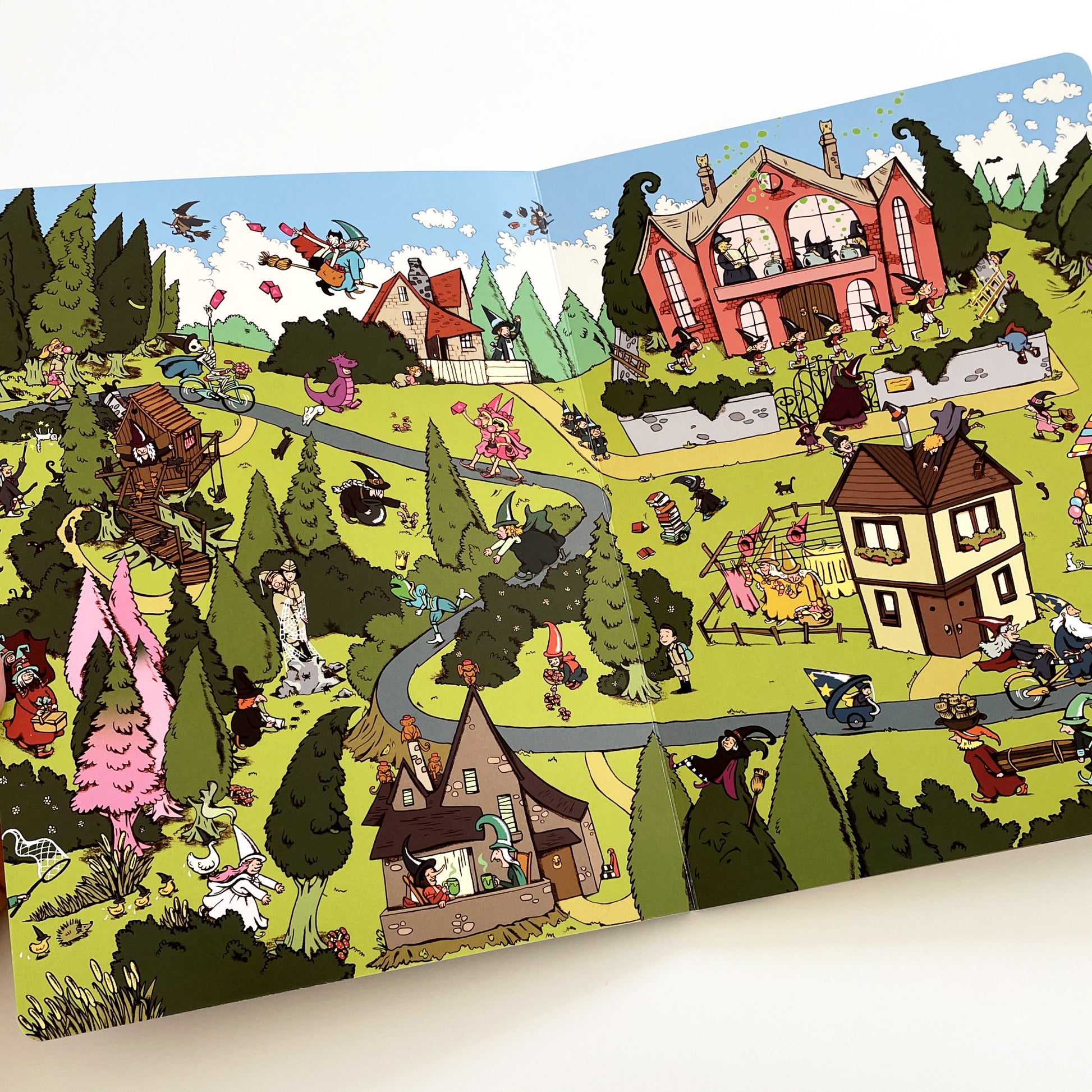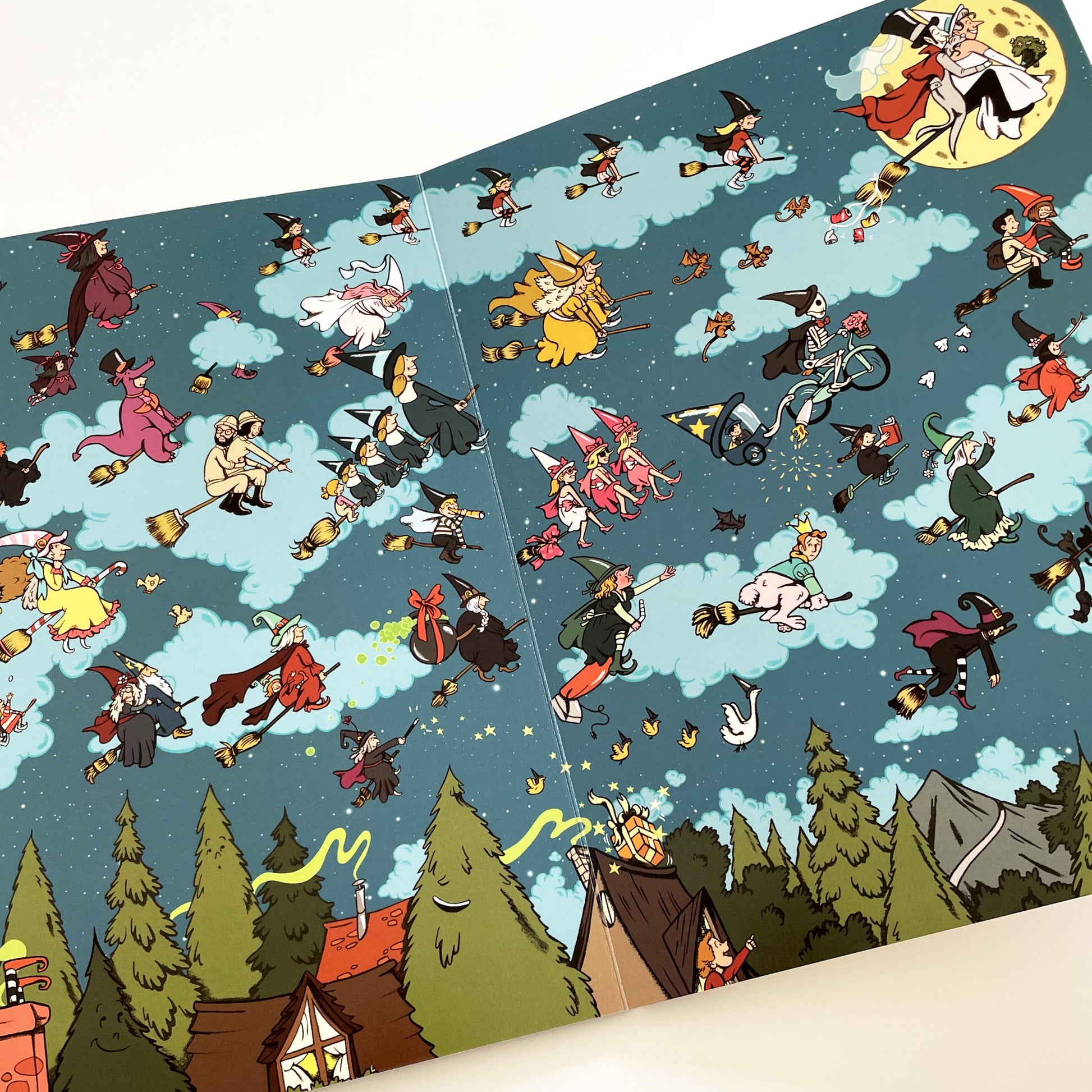 Однажды семья Покатушкиных отправилась на машине за город – а оказалась в волшебном лесу, где живут весёлые ведьмочки, скелеты, вампиры, совы, летучие мыши, черные коты. Как и любой виммельбух, «Весёлые ведьмочки» – это настоящее немое кино. Рассматривая книгу, дети научатся подмечать детали и самостоятельно составлять рассказ по картинкам.