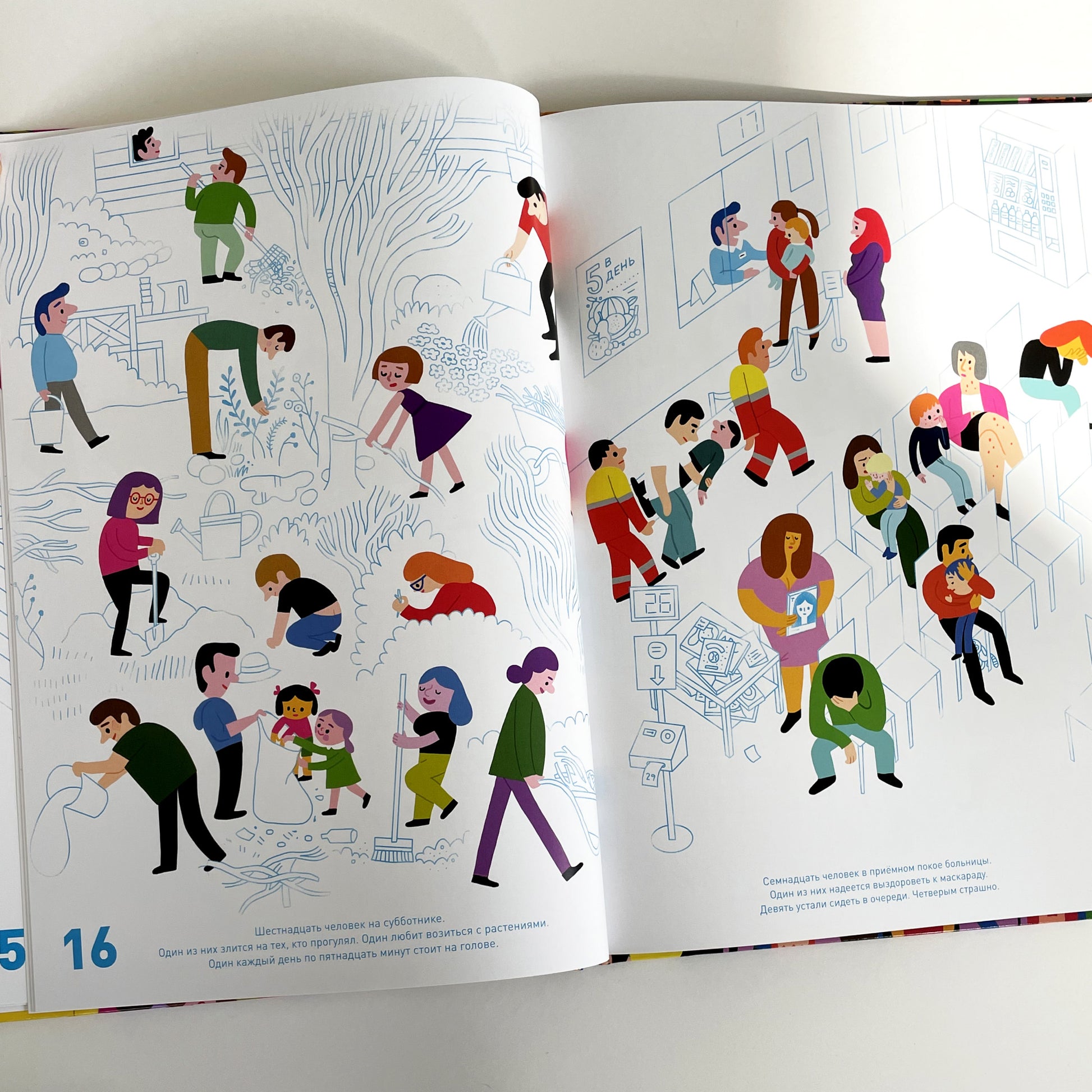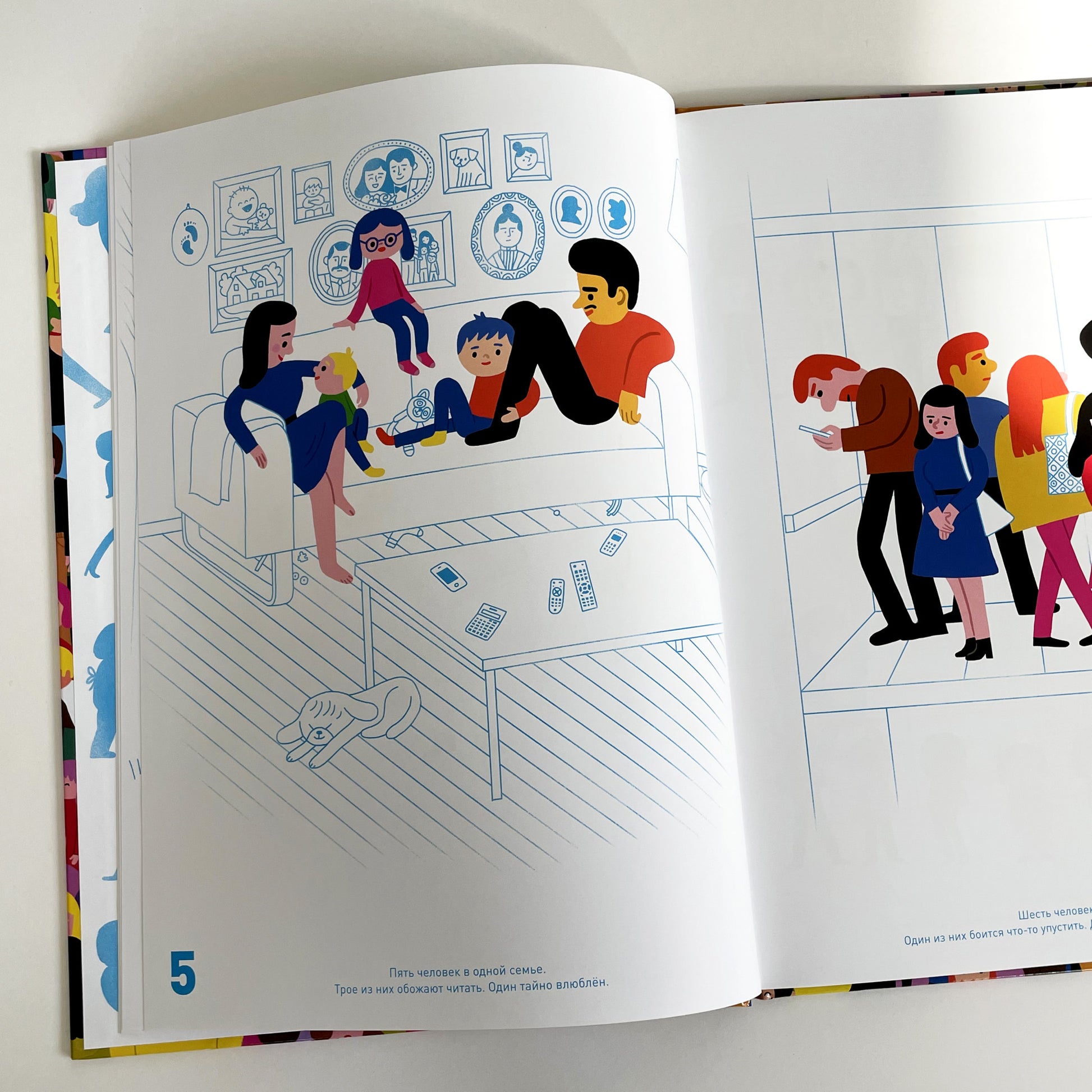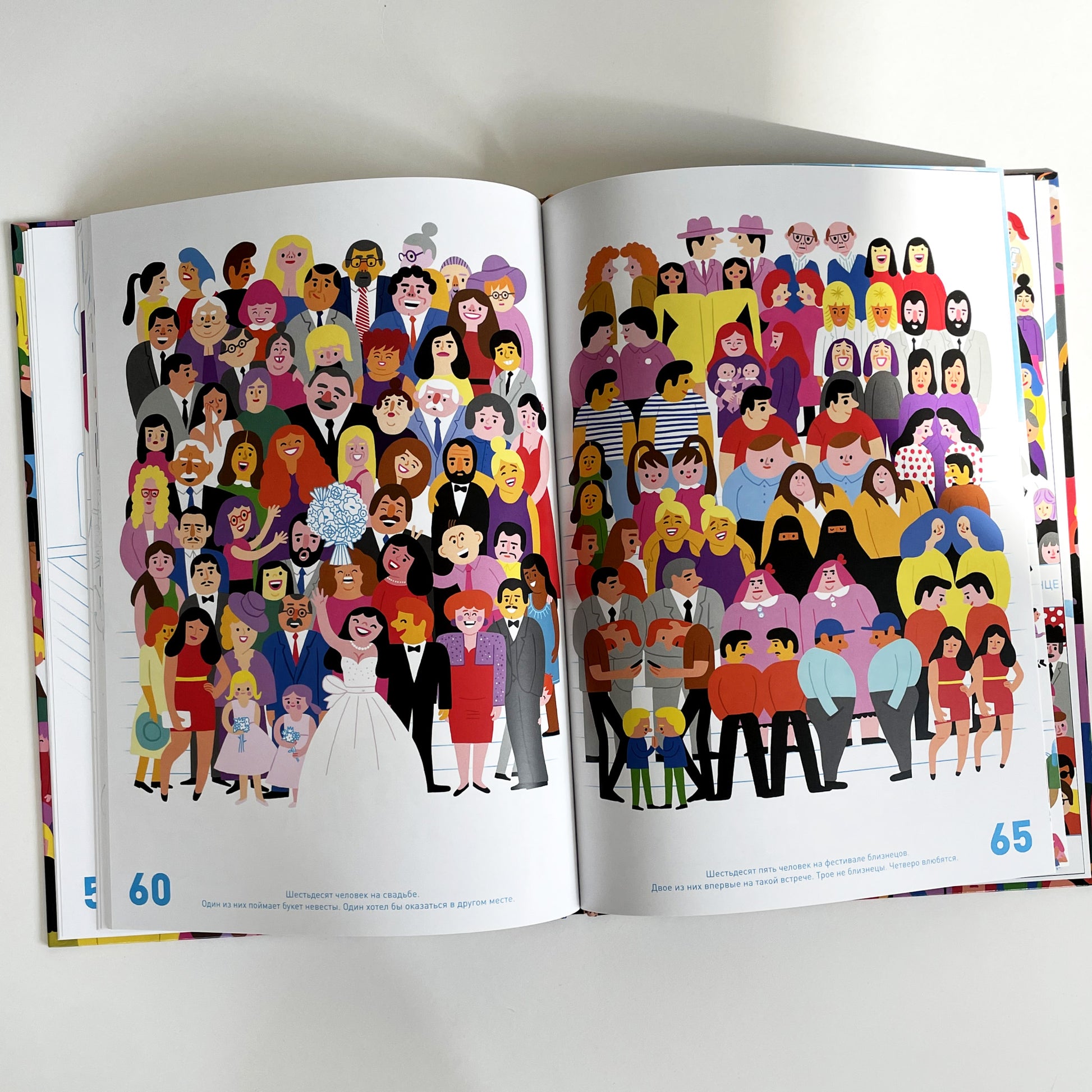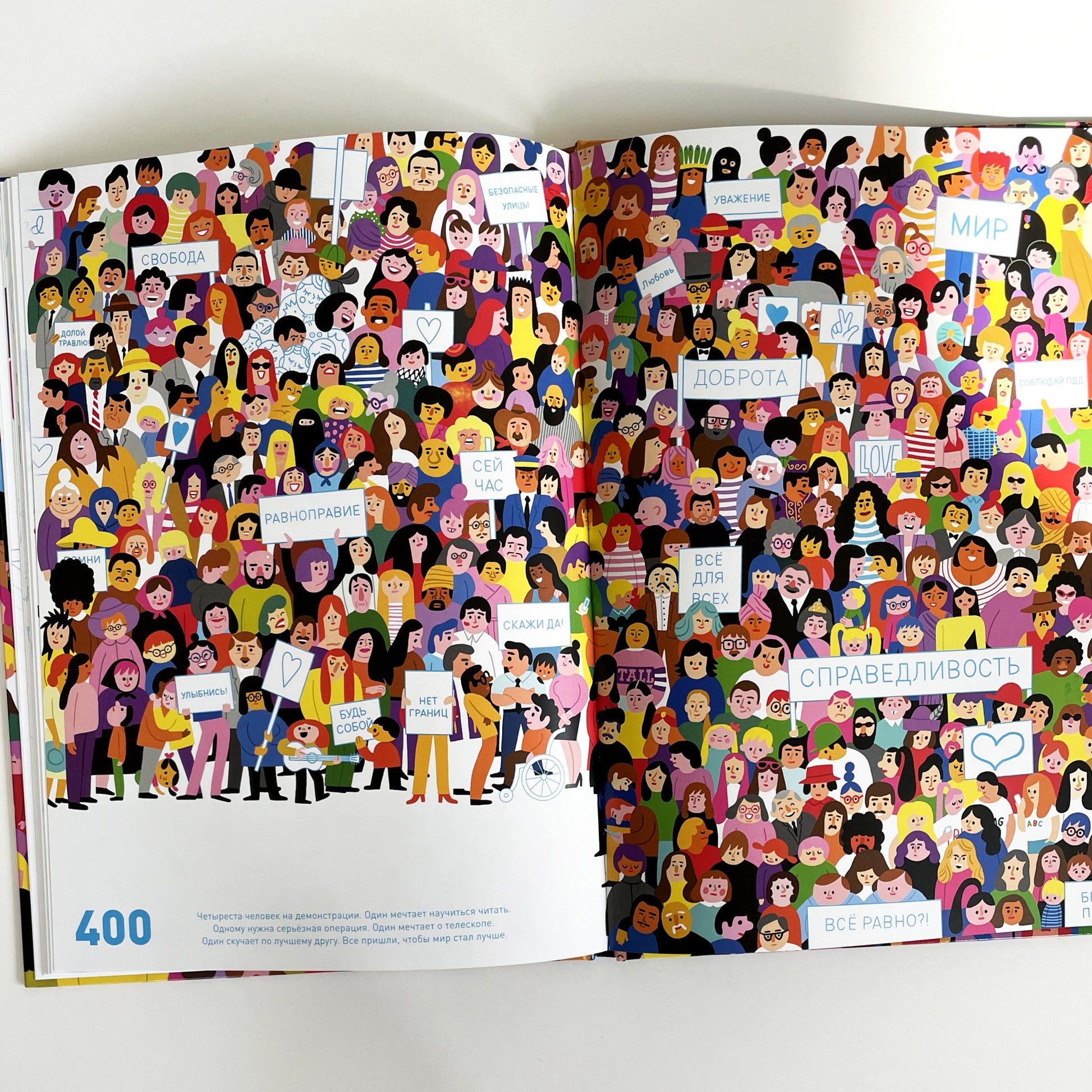 «Все считаются» — это и активити, и искалка, и книга на счет, и одновременно книжка-картинка о человечестве, и о роли каждого в огромном мире. Эта смешная книга научит считать от 0 до 7,5 миллиардов, а еще наблюдать за людьми, переживать с ними вместе разные эмоции и видеть, как переплетаются их истории. Ни один герой не появляется в книжке просто так, каждый — часть чего-то большего: семьи, блошиного рынка или толпы в аэропорту. И все связаны между собой! Легко убедиться, что все в мире очень разные, у всех своя жизнь, и, что еще важнее — что все считаются!