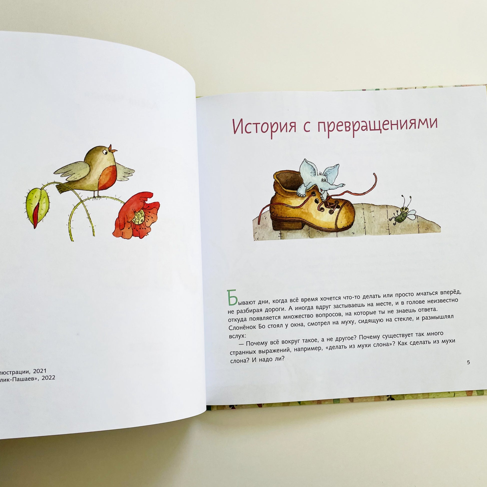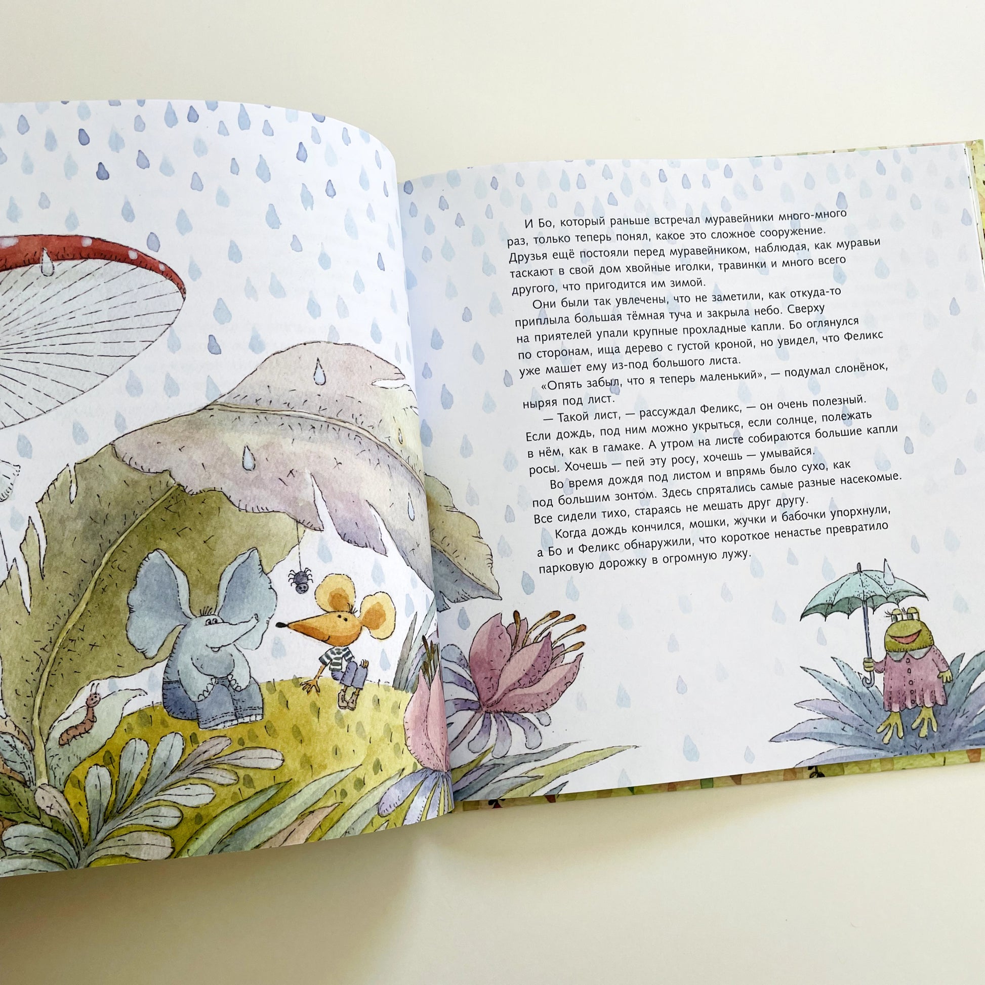 В первой истории слоненок Бо делается маленьким и смотрит на мир глазами своего друга мышонка Феликса. Он начинает замечать то, на что раньше не обращал внимание, и мир открывается ему с удивительной стороны. Оказывается, тычинки цветков похожи на барабанные палочки, а муравейник – очень сложное сооружение.