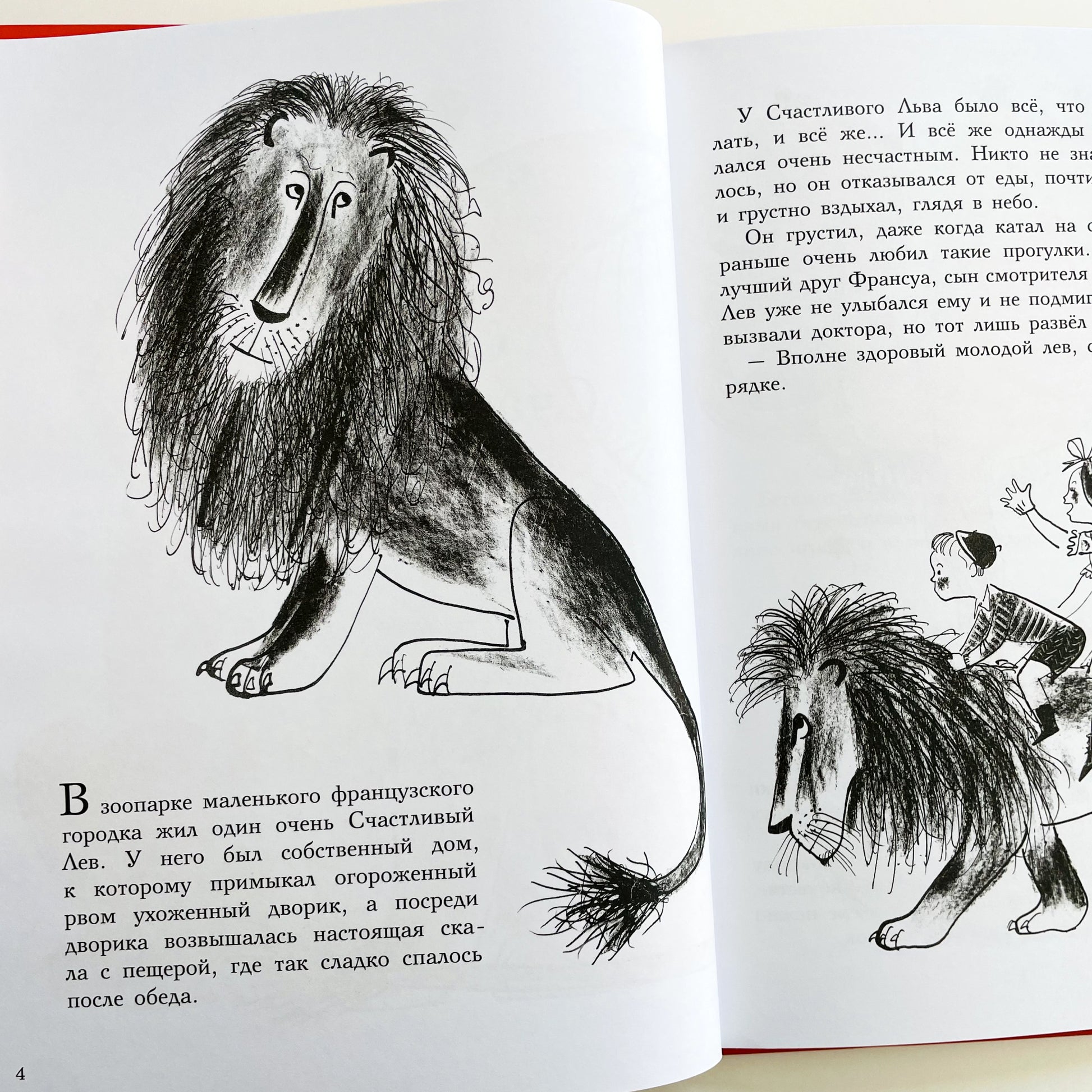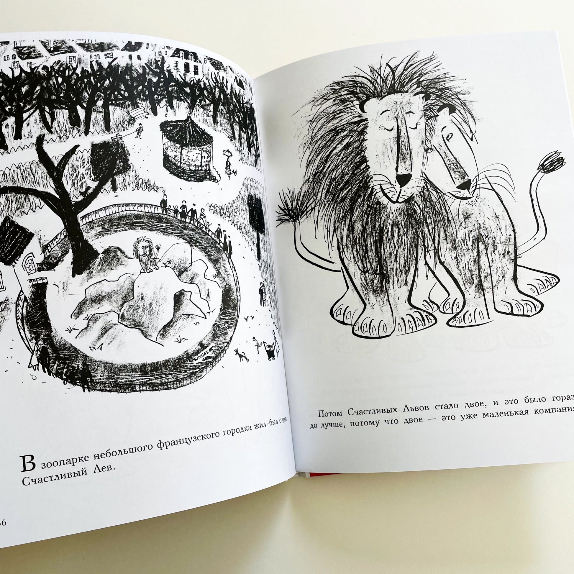 В книгу вошли две сказки о приключениях милого и дружелюбного льва, живущего в зоопарке небольшого французского городка: «Одинокий Счастливый Лев» и «Три Счастливых Льва». Эти сказки были созданы американским художником Роже Дювуазеном в 1950-х годах в соавторстве со своей супругой Луизой Фатио, и за прошедшие десятилетия стали классикой детской литературы.