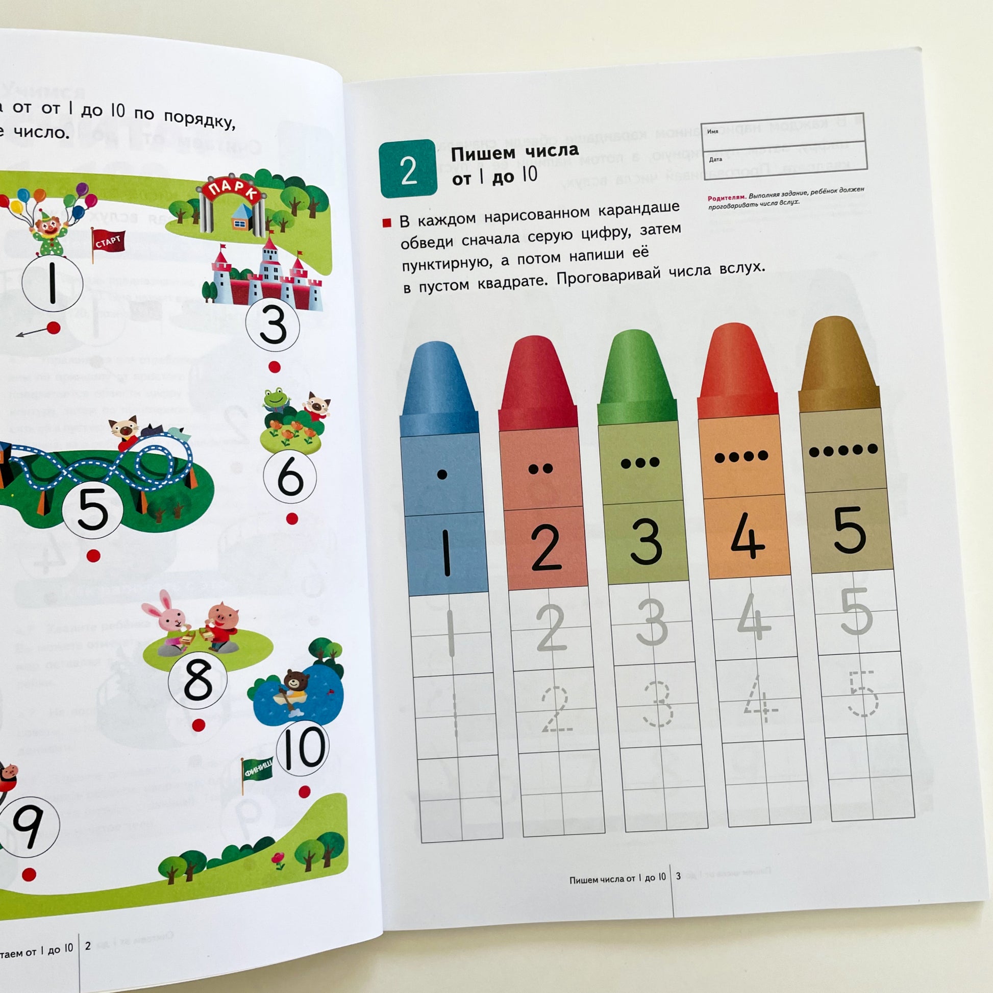 Задания на отработку навыка письма построены по принципу от простого к сложному. Выполняя одно за другим однотипные задания, ребёнок быстро запомнит форму цифр и освоит принцип их написания.
