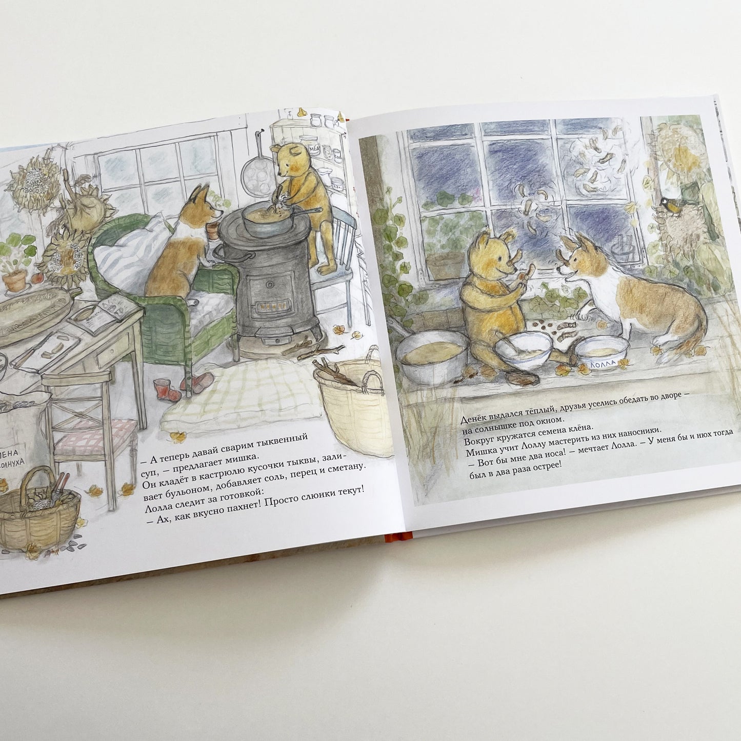 Осень – хлопотливая пора для мишки Бруно и собаки Лоллы. Они собирают урожай, делают запасы на зиму, сгребают в кучи опавшие листья, заготавливают семена для будущих посевов, а еще варят тыквенный суп и пекут яблочный пирог.