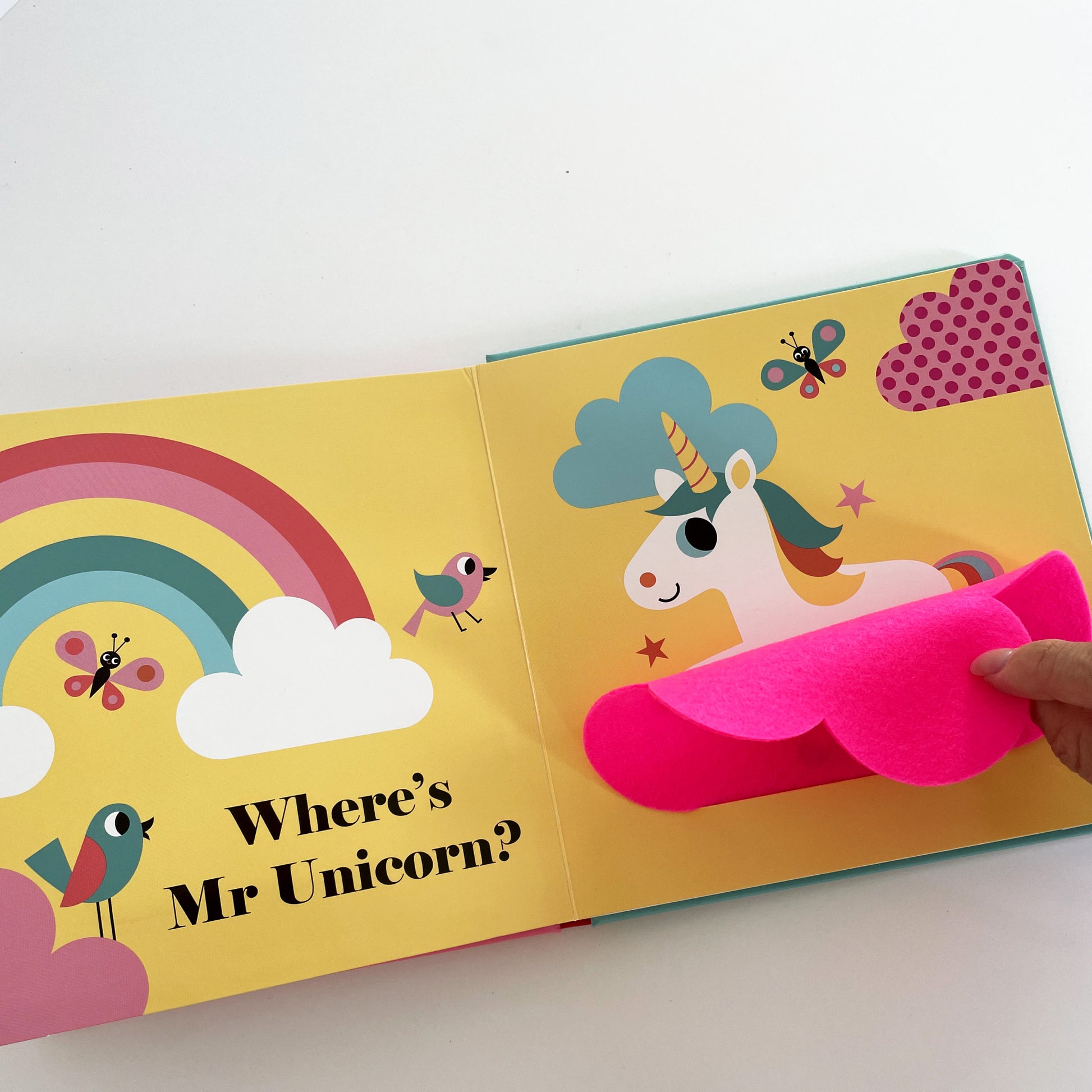 Open the neon pink cover of Where’s Mr Unicorn? and you’re on the look out for Mrs Mermaid, Mr Dragon, Mrs Fairy and Mr Unicorn himself!