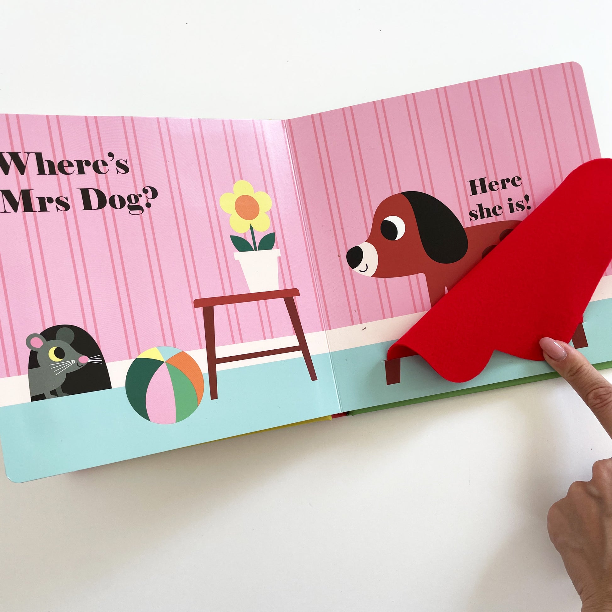 In Where’s Mrs Cat?, you’re on the look out for Mr Goldfish, Mrs Dog, Mr Guinea Pig and Mrs Cat herself!