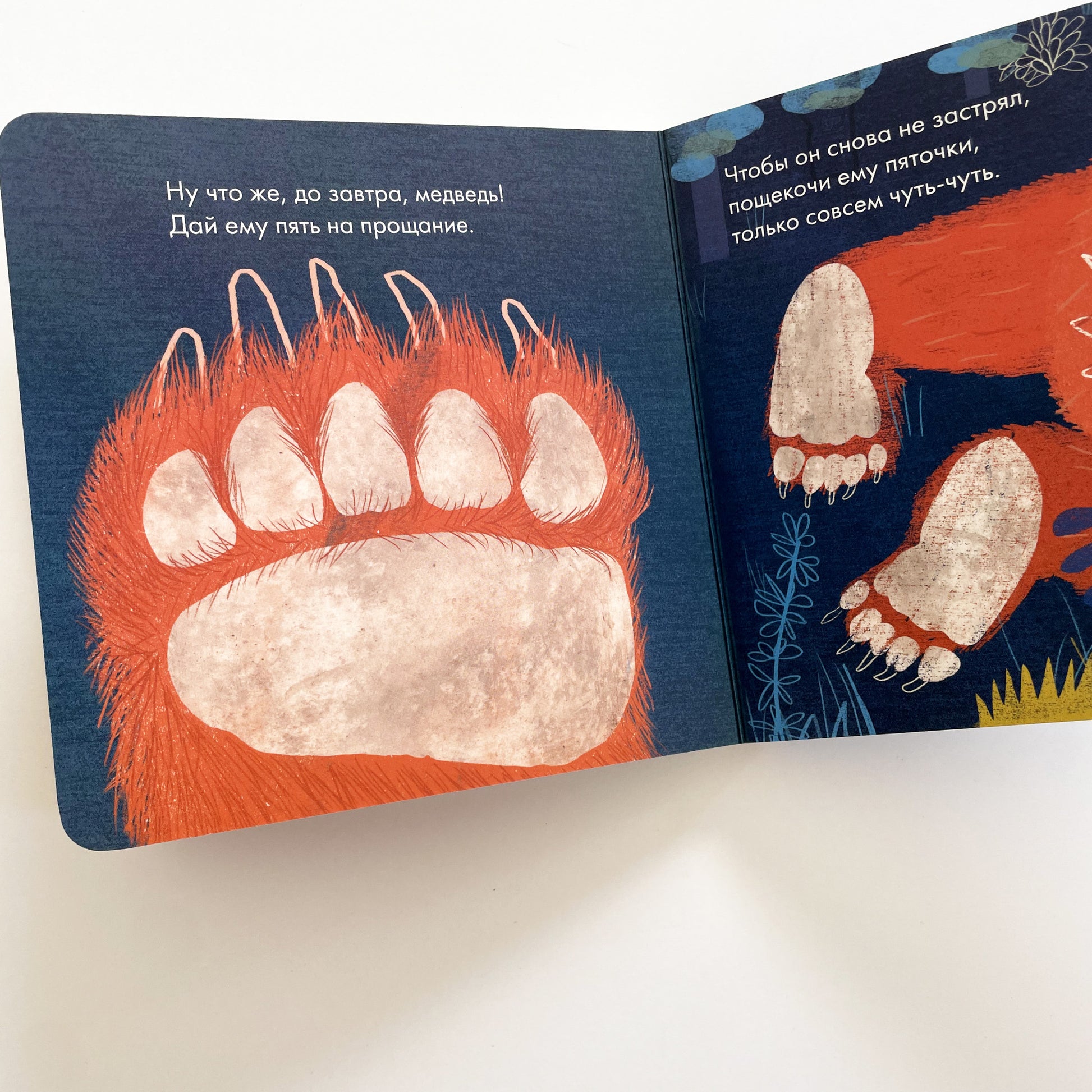 Это книжка-игра, в которой читатель принимает непосредственное участие, проживая с медведем один день его жизни. Ребёнок разговаривает с героем, может его пощекотать, пожалеть, погладить, дать пять, зевнуть вместе с ним и, пожелав медведю спокойной ночи, лечь спать.