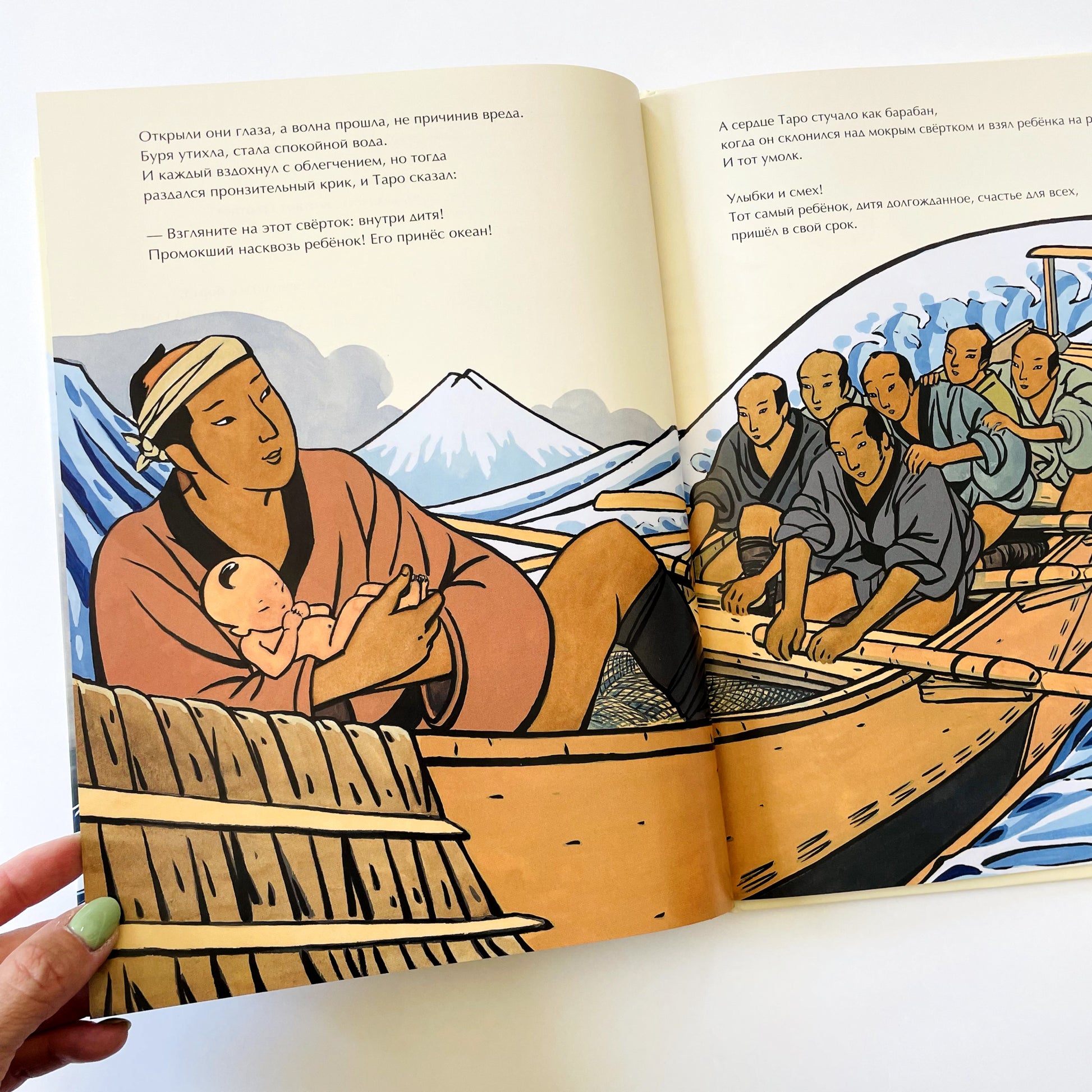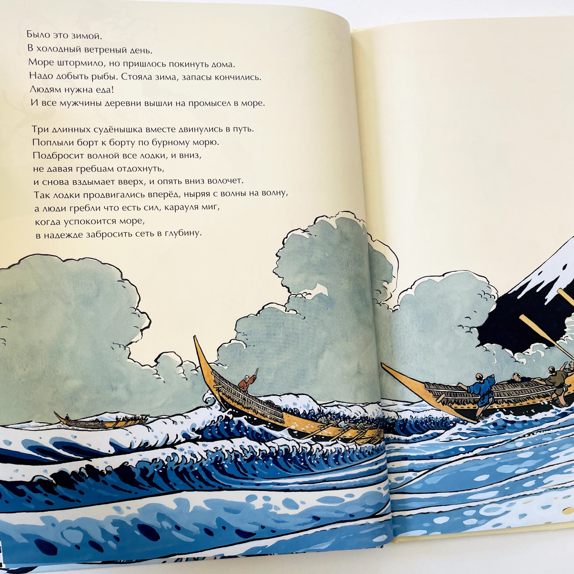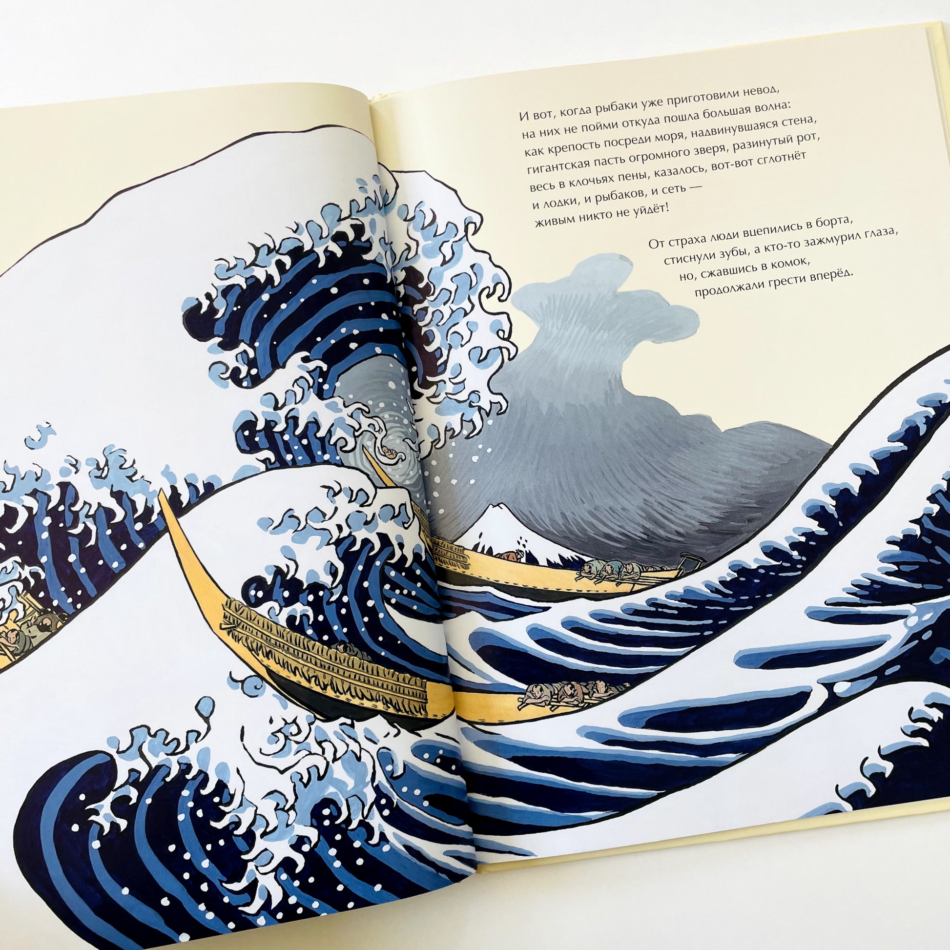 Эту поэтичную историю автор и иллюстратор создали под впечатлением от знаменитой гравюры Кацусики Хокусая «Большая волна в Канагаве».