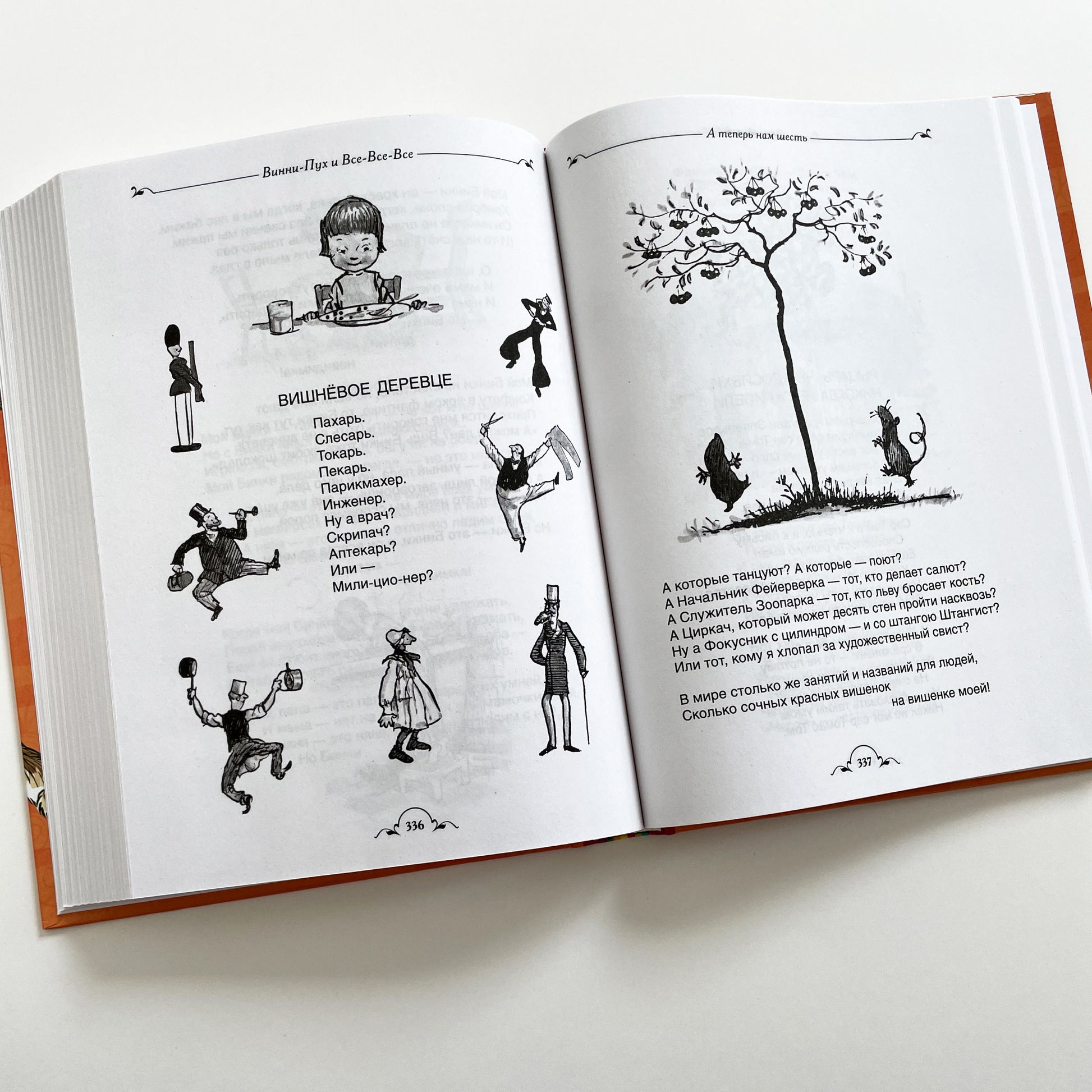В книгу вошли две сказки про веселого, никогда не унывающего медвежонка и его друзей: мальчика Кристофера Робина, поросенка Пятачка, Кролика, ослика Иа-Иа и многих других: «Винни-Пух» и «Дом на Пуховой Опушке», стихи и песенки Винни-Пуха, а также два сборника стихов: «Когда мы были еще маленькие» и «А теперь нам шесть», которые Алан Милн сочинил для своего сына. А перевели эти чудесные произведения известные детские писатели Самуил Маршак и Борис Заходер.