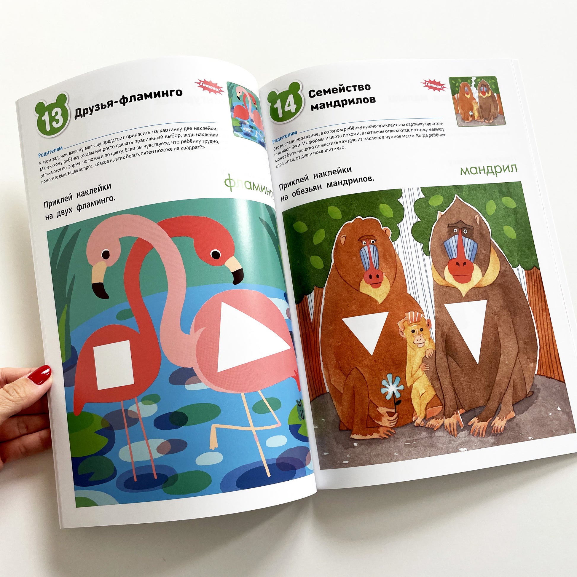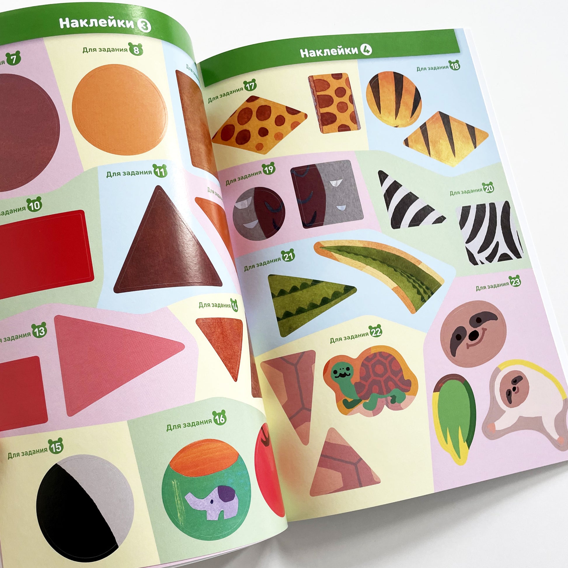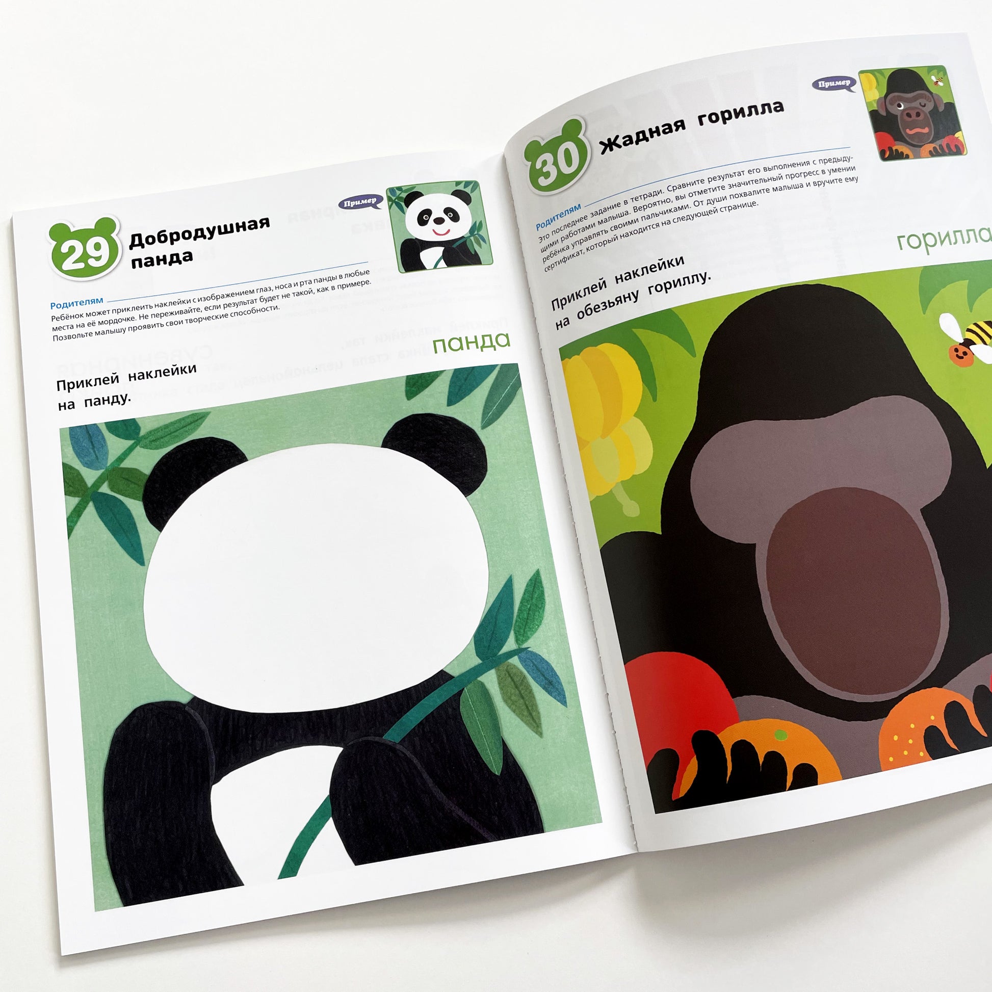 Тетрадь учит малыша работать с наклейками. Она подойдет для тех детей, кто еще не пробовал приклеивать стикеры или имеет совсем мало опыта.
