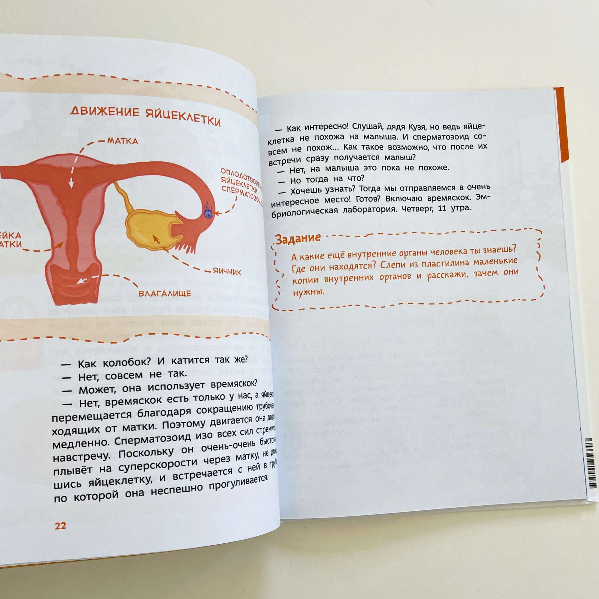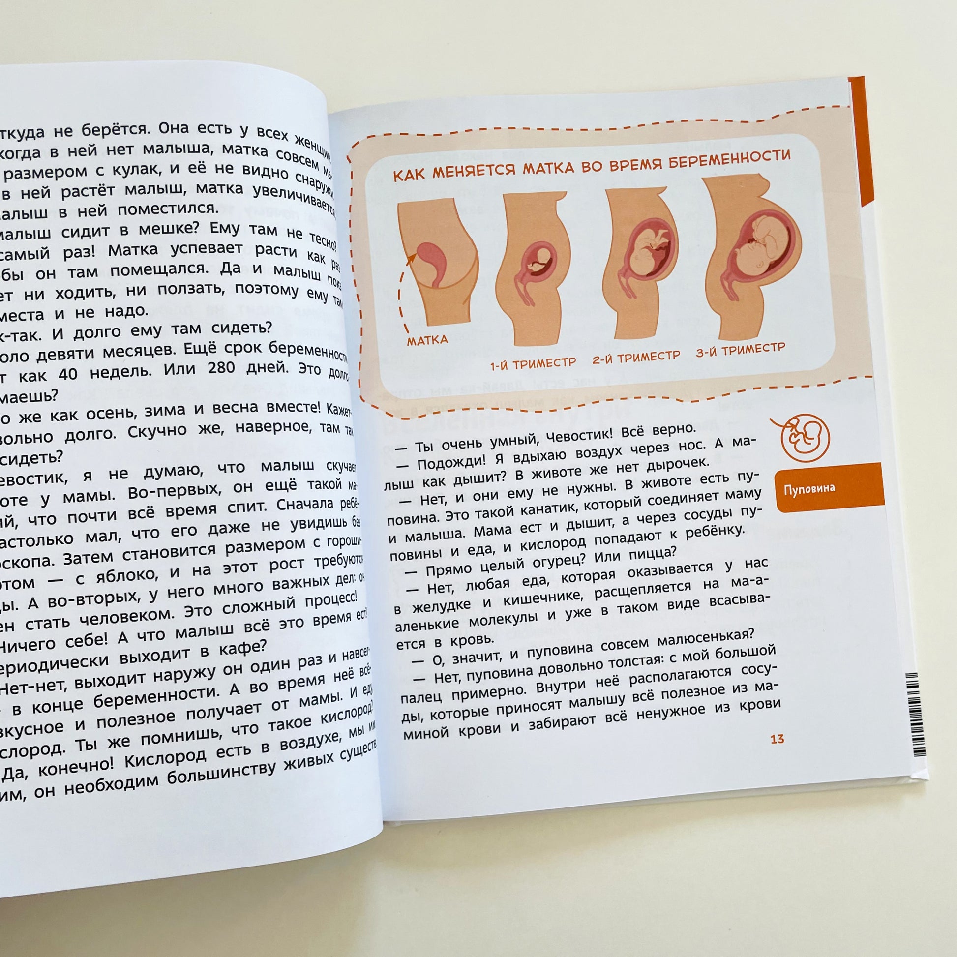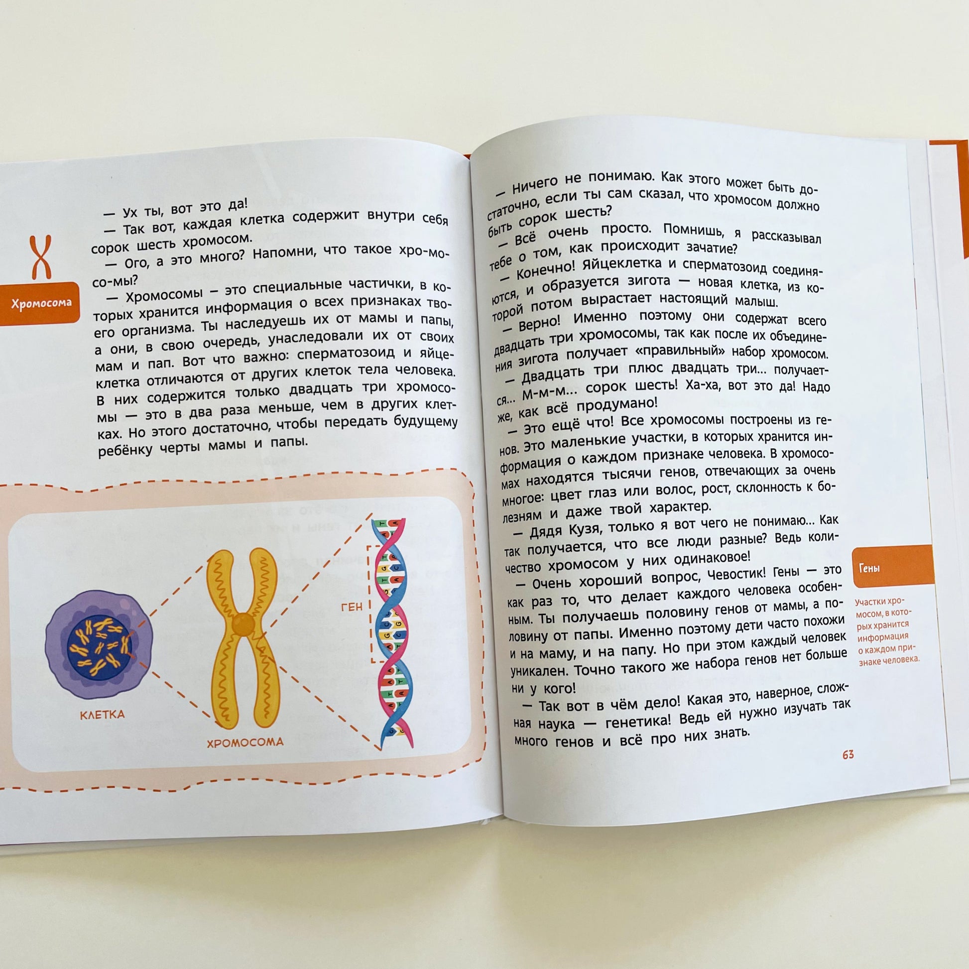В новой книги серии детских энциклопедий Чевостик и дядя Кузя отправятся в необычное путешествие. Они изучат особенности строения мужского и женского организмов и узнают, как на свет появляется человек, побывают в медицинской лаборатории и увидят, как из клеток мамы и папы получается эмбрион, как он растет у мамы в животе и превращается в малыша, чем он там питается и занимается. А ещё выяснят, что такое гены, какая наука их изучает и почему они делают каждого человека особенным!