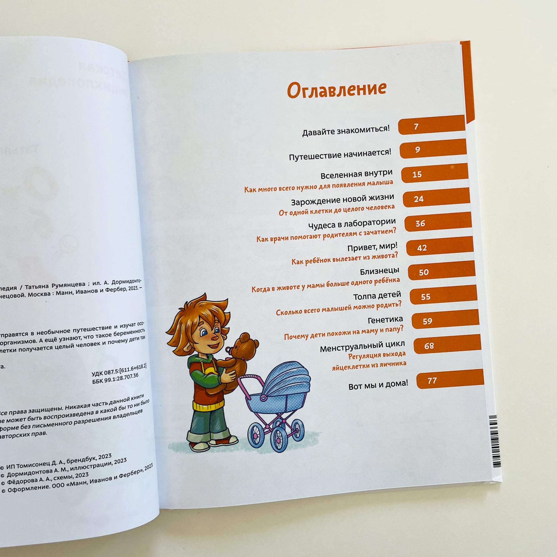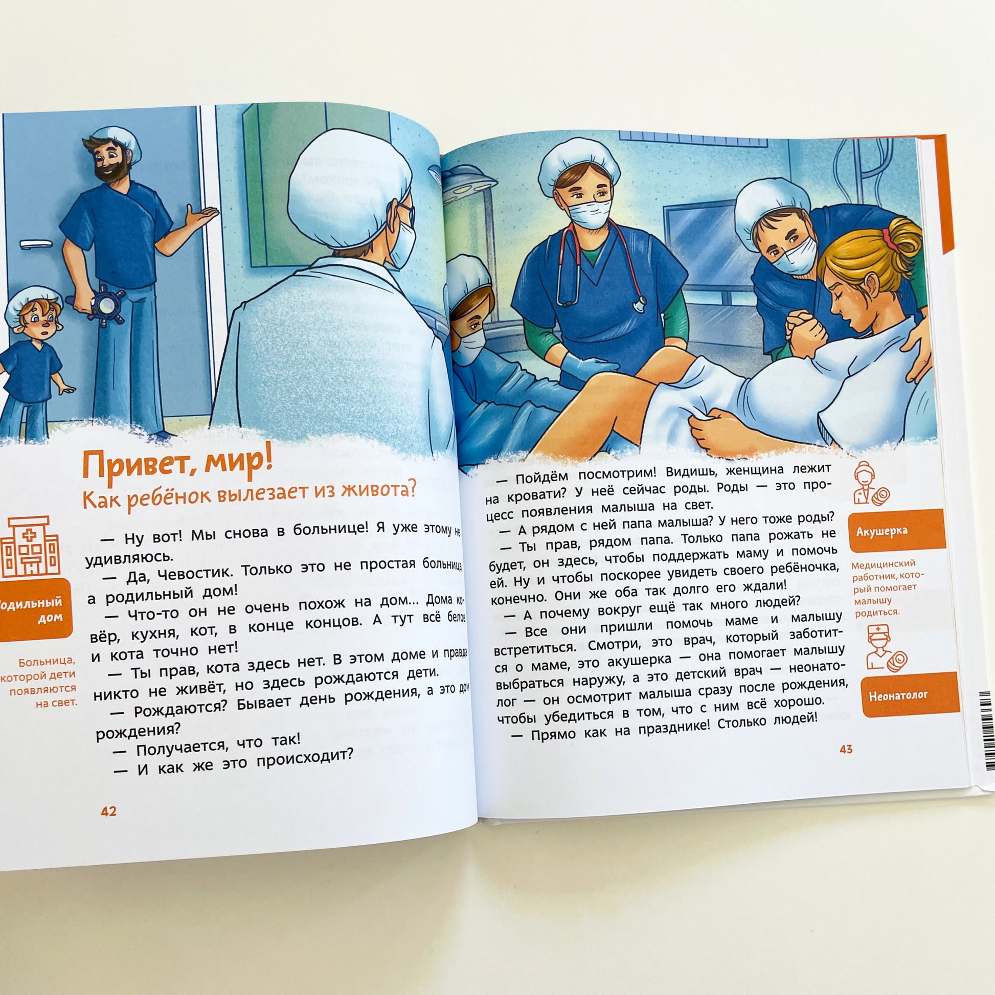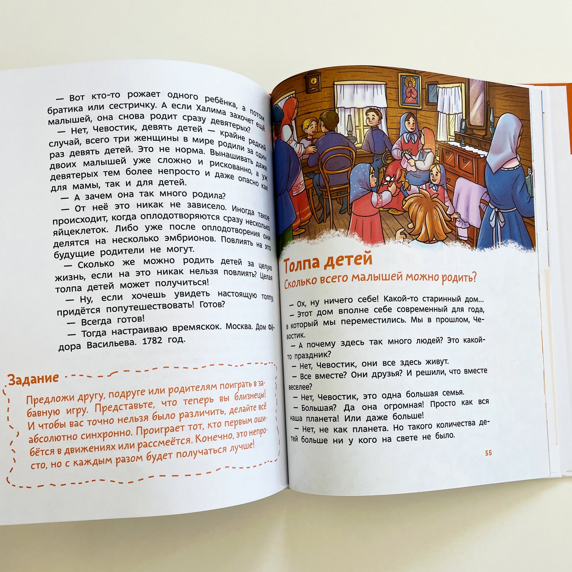 В новой книги серии детских энциклопедий Чевостик и дядя Кузя отправятся в необычное путешествие. Они изучат особенности строения мужского и женского организмов и узнают, как на свет появляется человек, побывают в медицинской лаборатории и увидят, как из клеток мамы и папы получается эмбрион, как он растет у мамы в животе и превращается в малыша, чем он там питается и занимается. А ещё выяснят, что такое гены, какая наука их изучает и почему они делают каждого человека особенным!