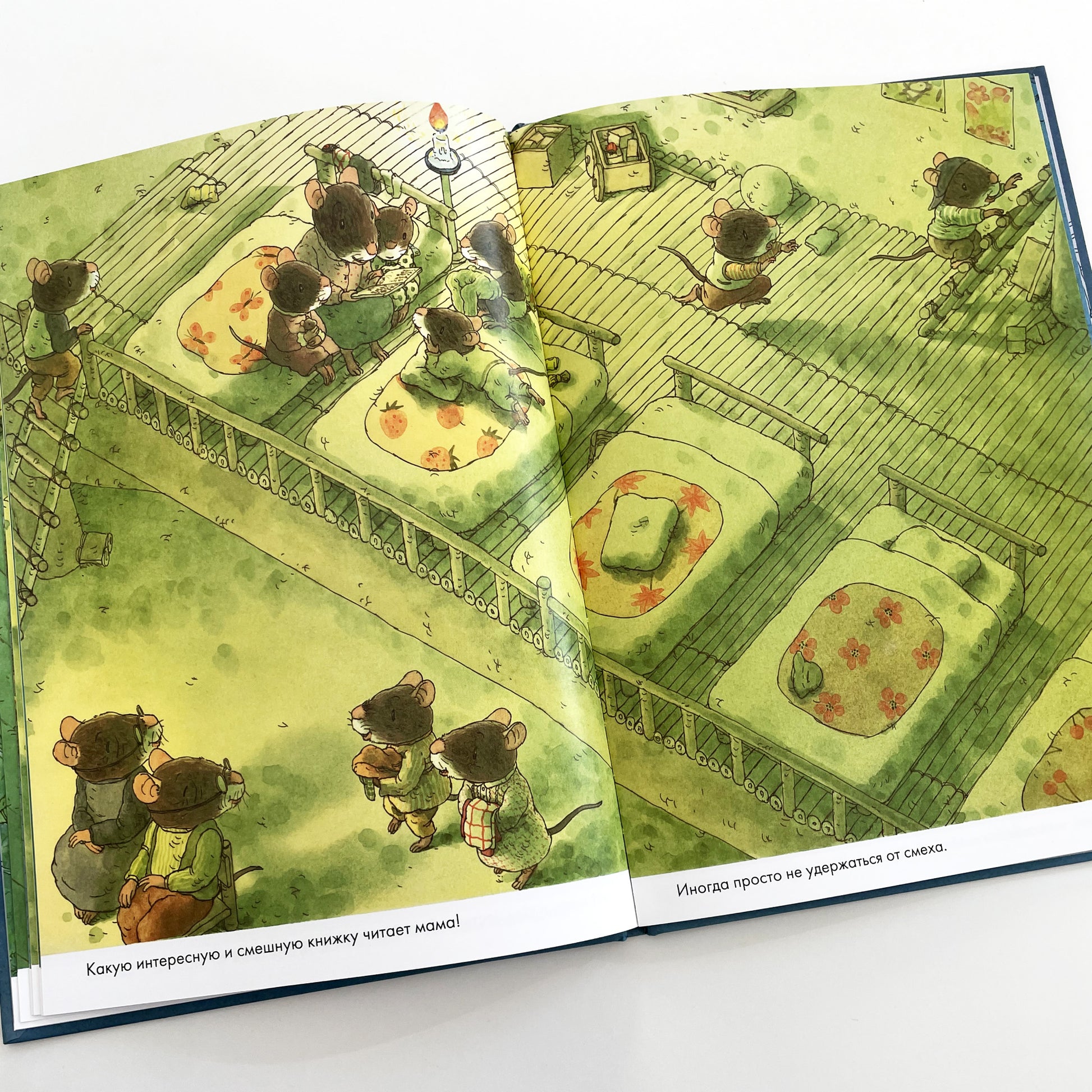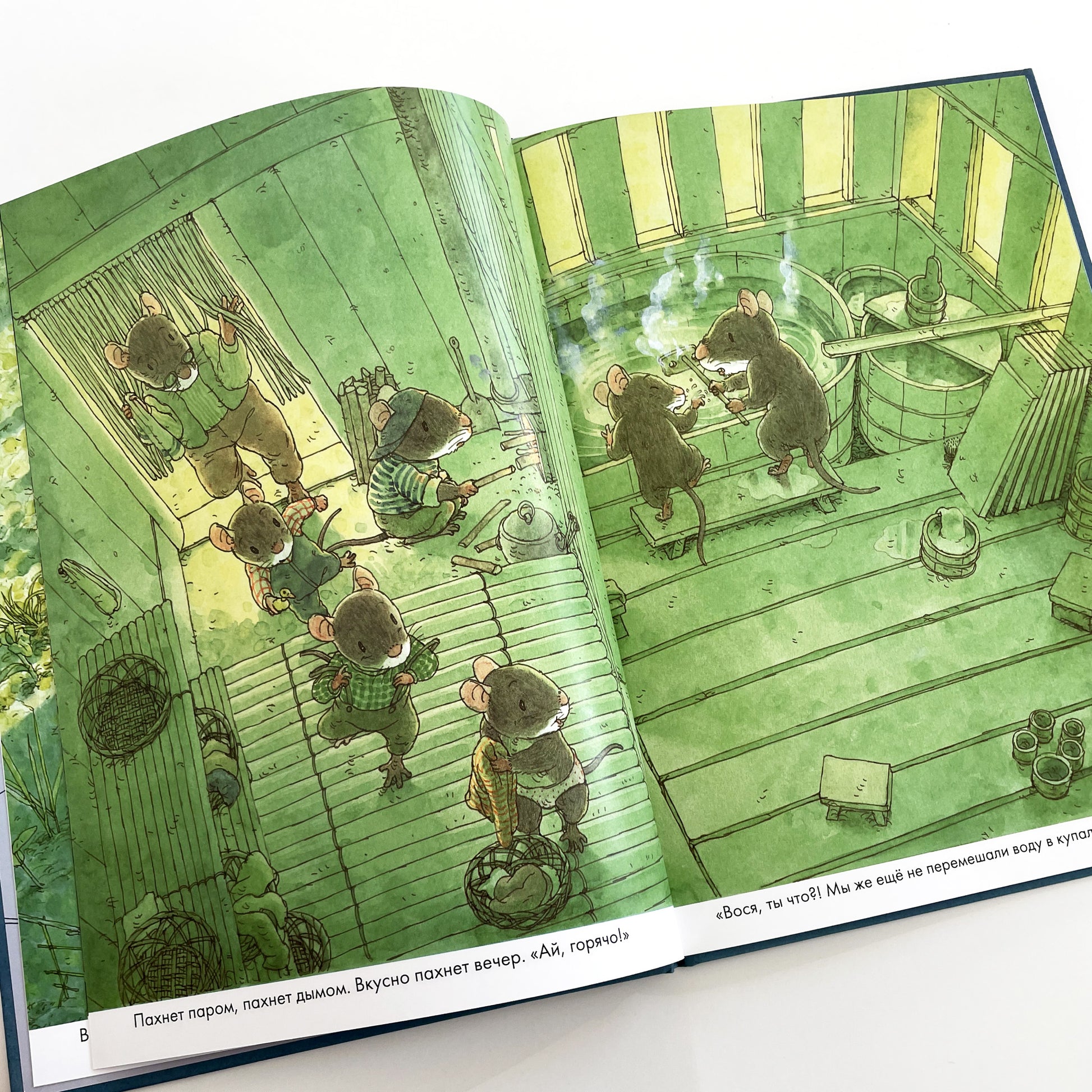 «14 лесных мышей. Колыбельная» — об окончании длинного и полного событий дня и нежных и важных вечерних ритуалах. Теплая японская баня с купаниями и играми, уютный ужин, истории, которые мышата рассказывают друг другу по очереди. И, конечно, вечерняя мамина сказка и бабушкина колыбельная: укладываться спать с мышиным семейством — настоящее удовольствие!