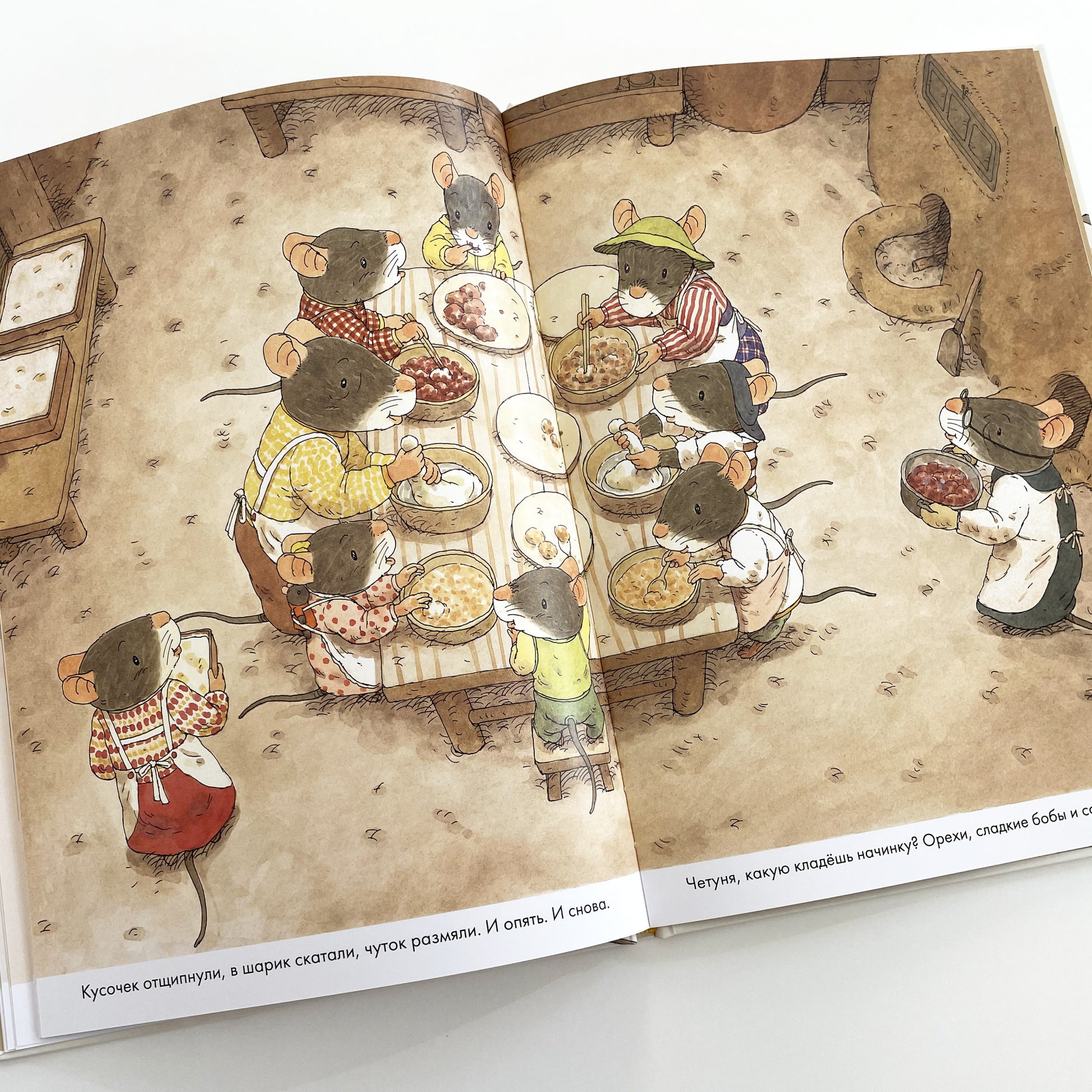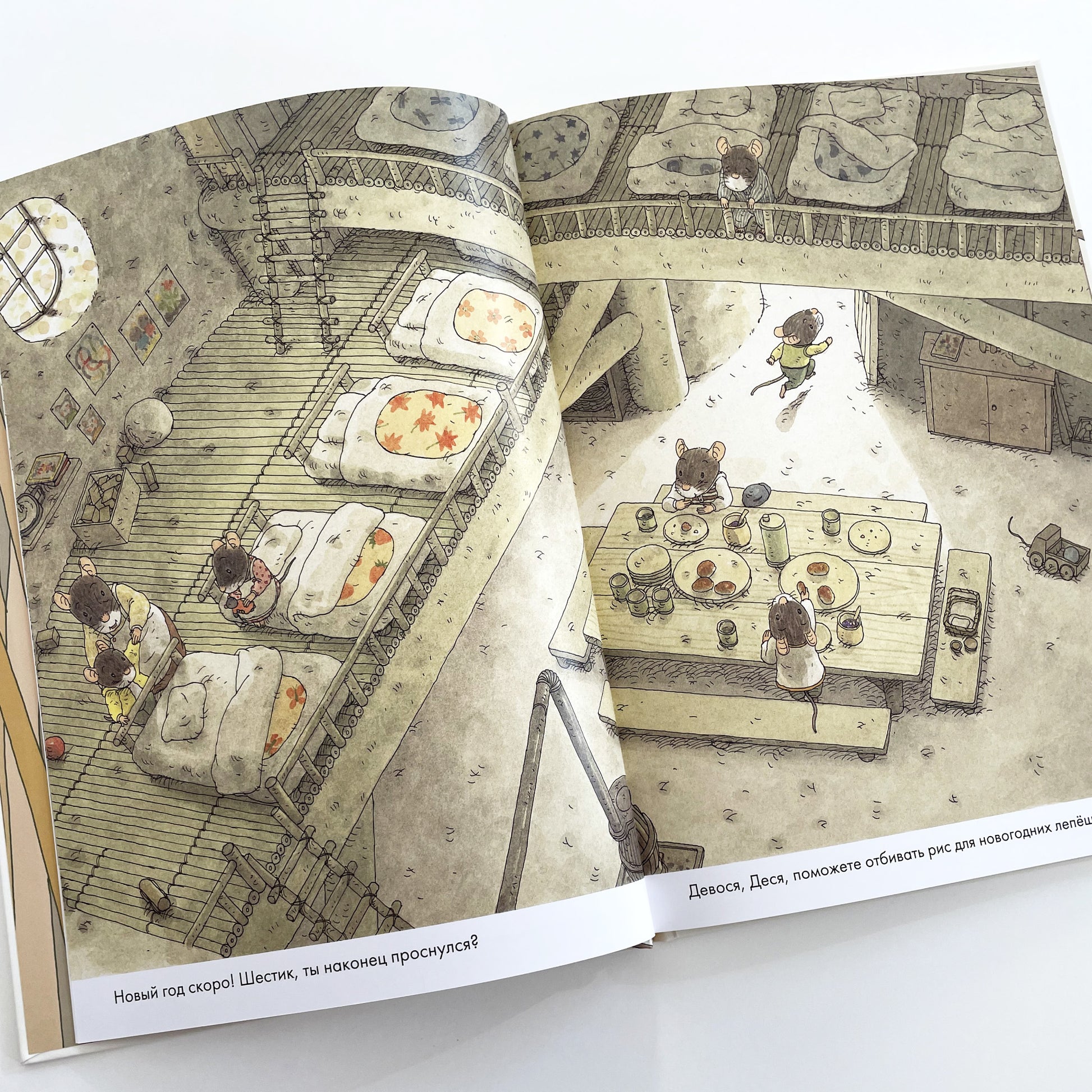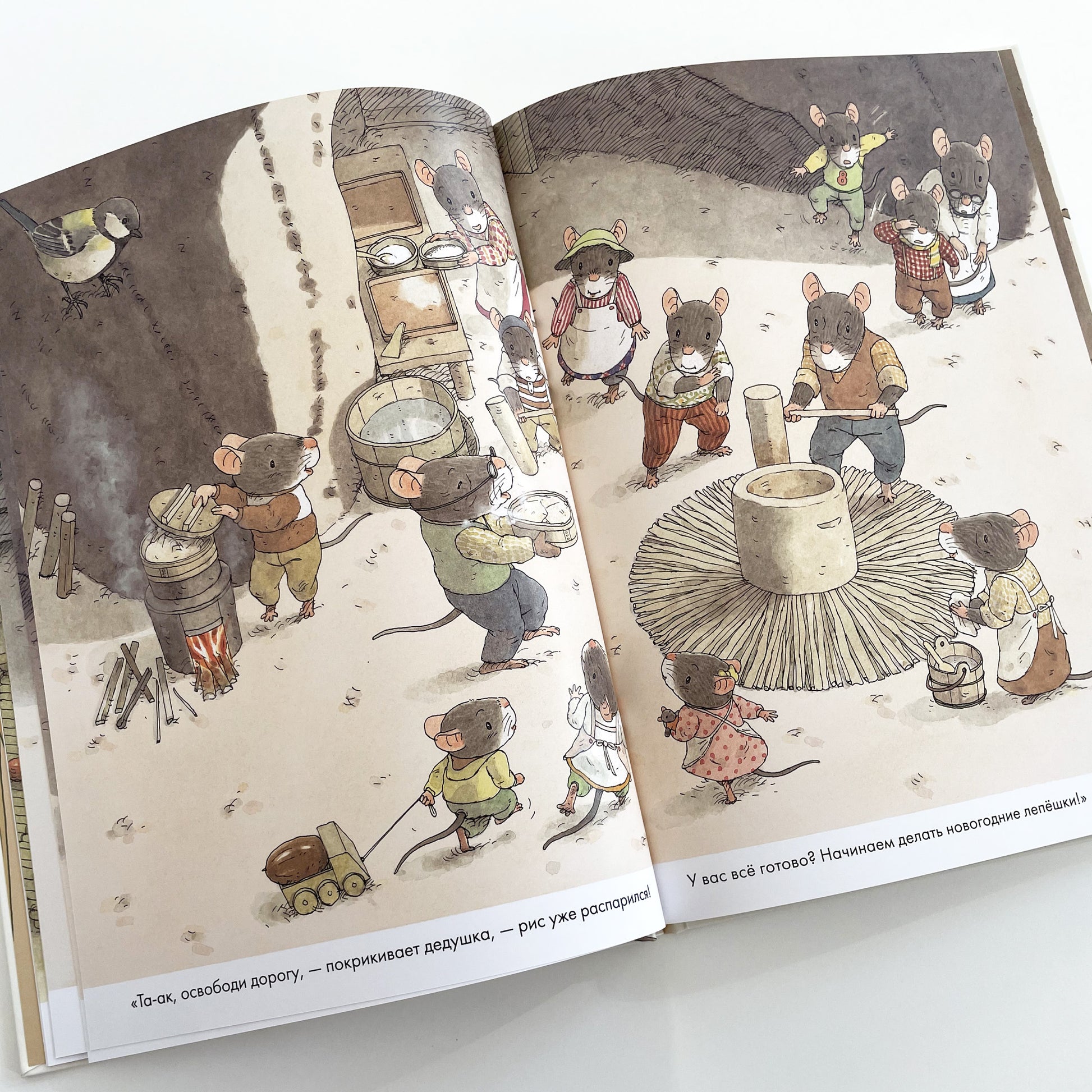 В каждой стране свои новогодние традиции! В книге «14 лесных мышей. Новый год» мышиное семейство готовит традиционное японское новогоднее блюдо — рисовые лепешки о-моти. Как любое праздничное блюдо, лепешки требуют усилий всех членов семьи — сделать тесто, развести огонь в специальных печурках, приготовить вкусные начинки! Чем больше постараться — тем вкуснее яства на новогоднем столе!