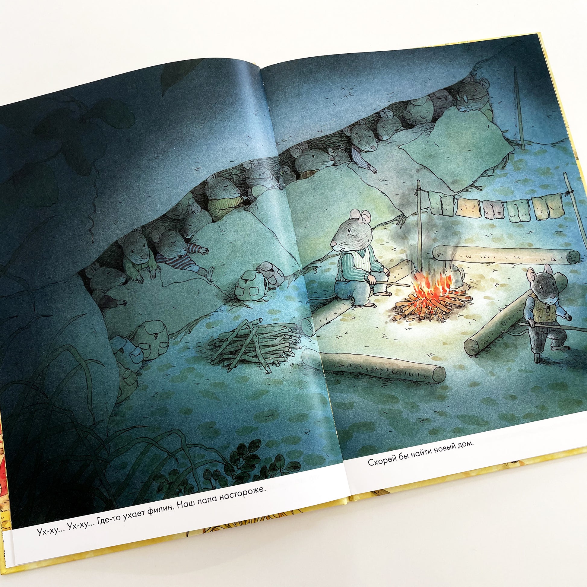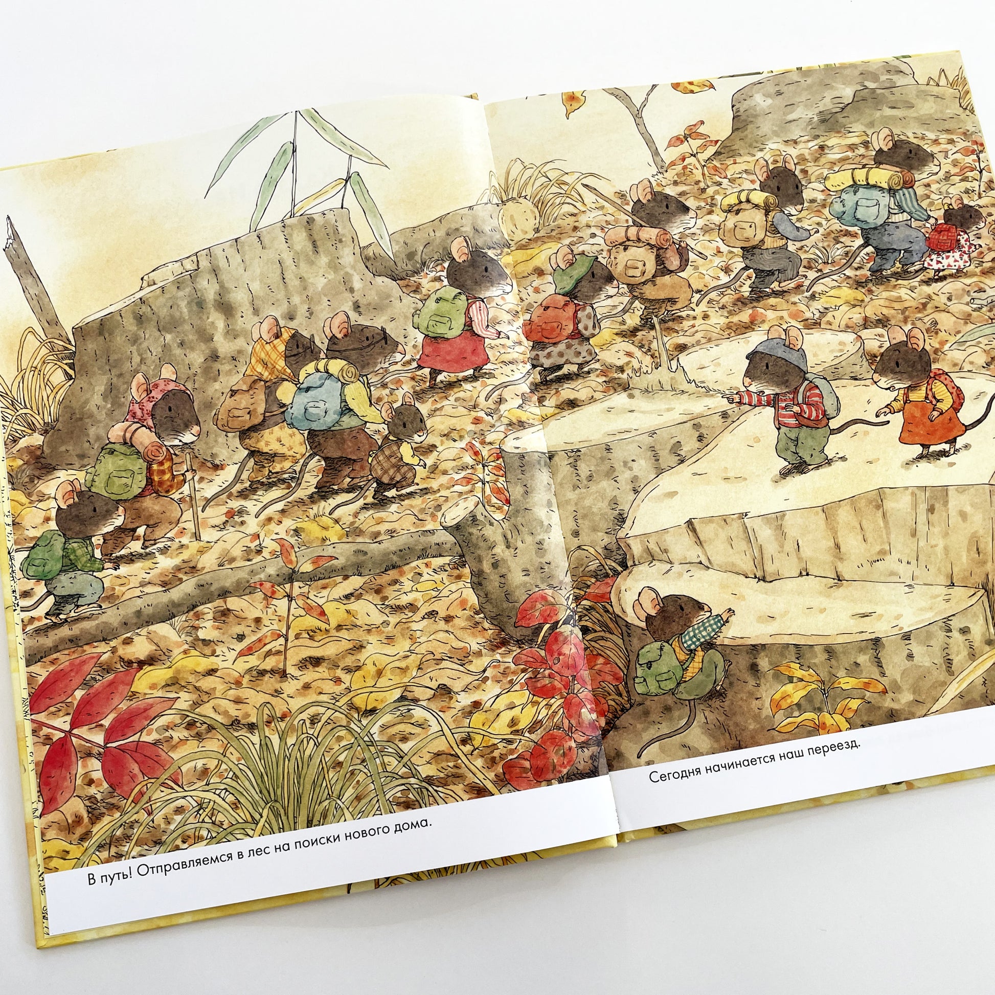 В книге «14 лесных мышей. Переезд» мышки ищут новый домик: пробираются через преграды и опасности по лесу, обживаются в новом жилище, строят мост и водопровод, делают припасы на зиму и, конечно, отмечают переезд. Все получается, когда семья делает все вместе, а старшие помогают младшим. Спокойно и уютно в новом домике, и удивительным светом сияет свечка на столе.