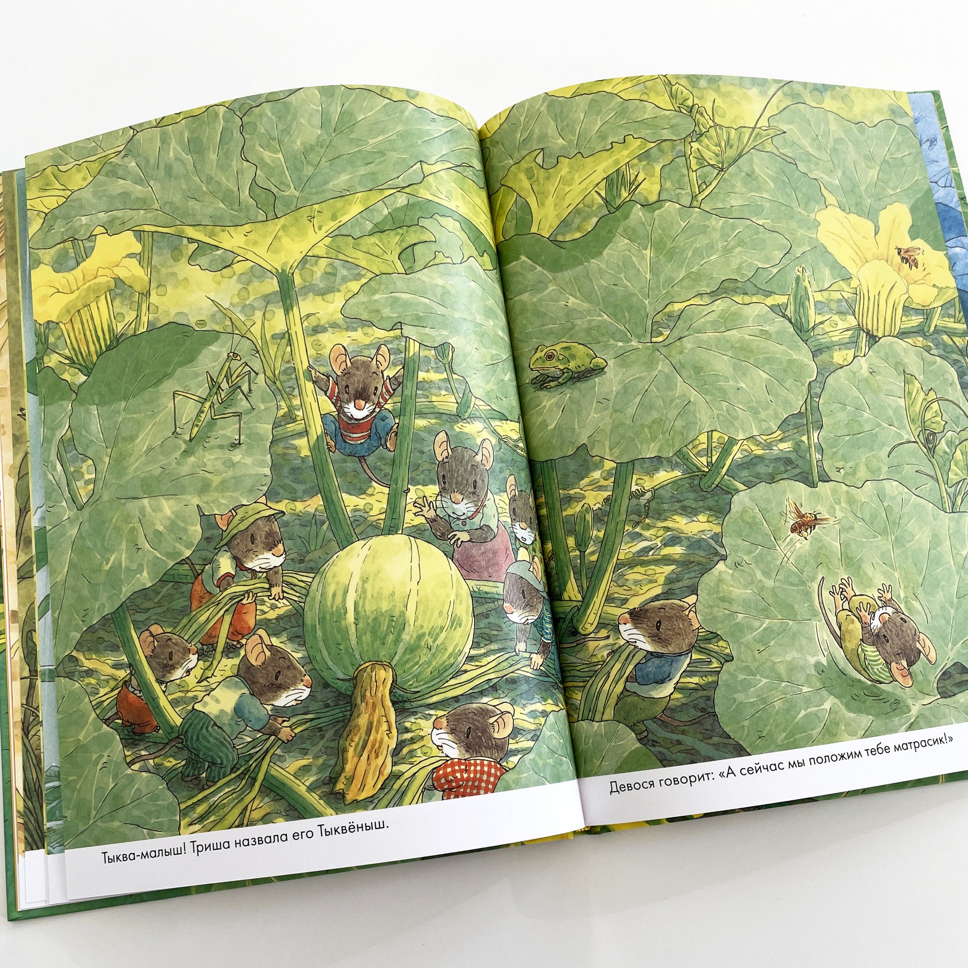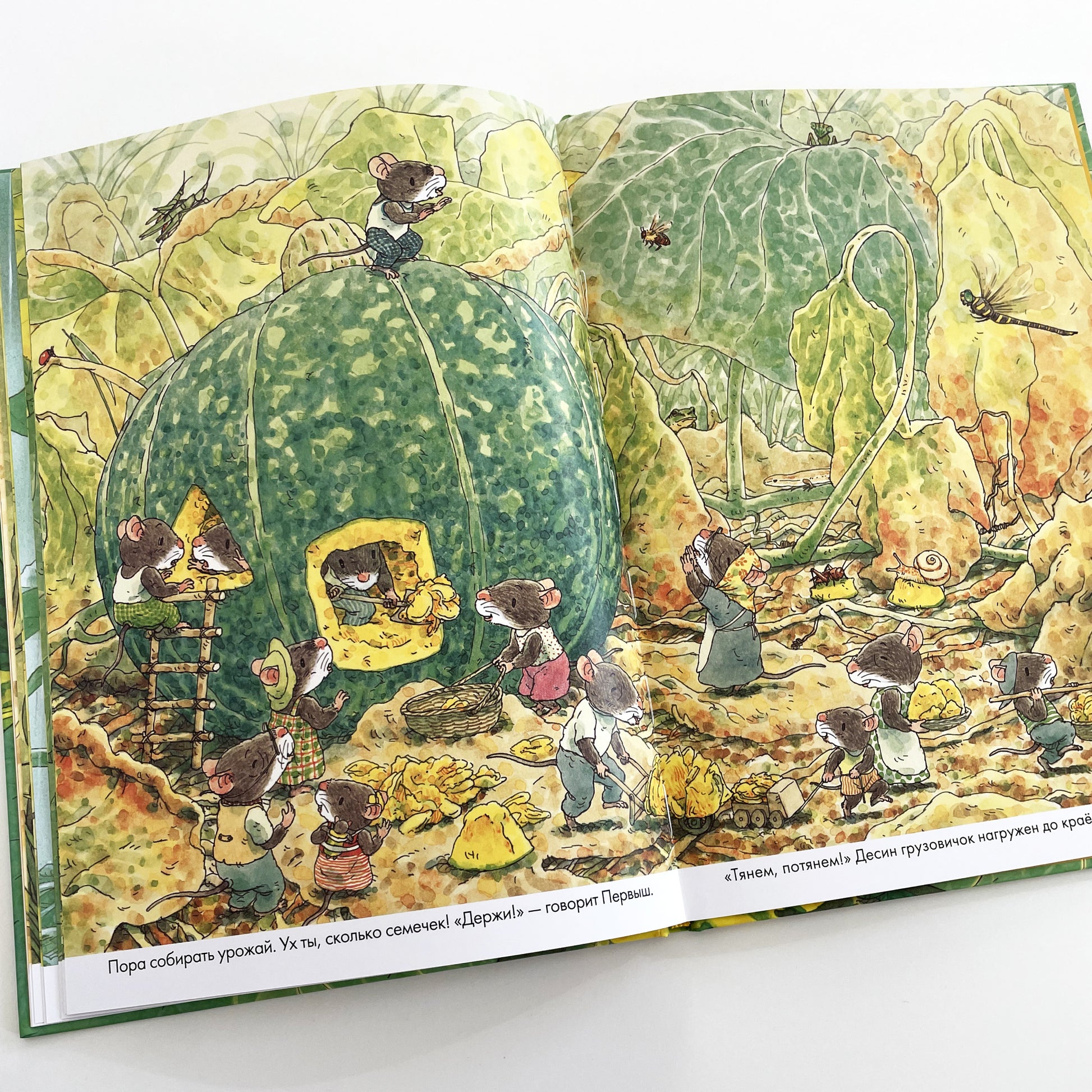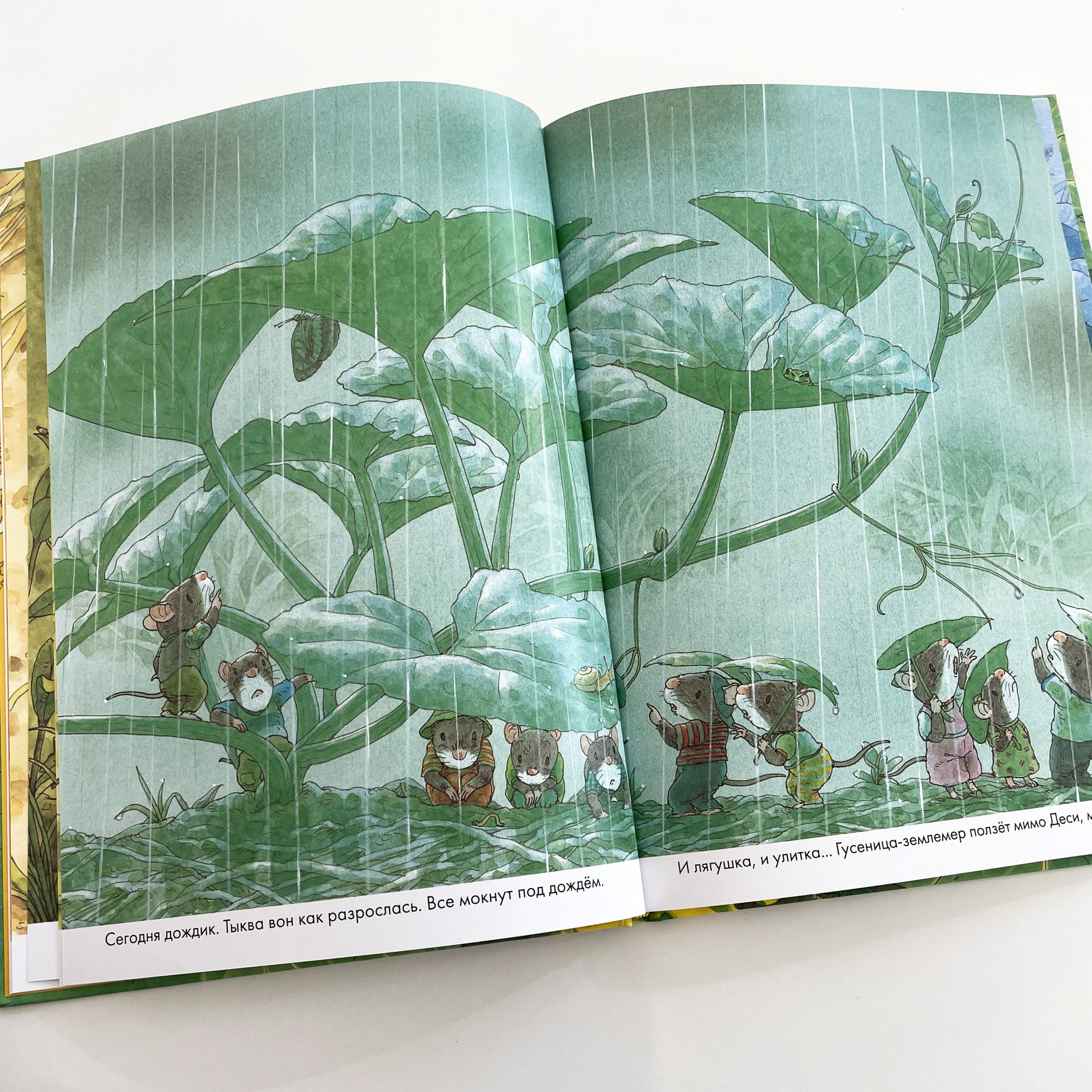 В книге «14 лесных мышей. Тыква» все семейство огородничает — мышата сначала сажают семечко тыквы, а потом ухаживают за ним и день за днем, наблюдают за ростком, бутоном, цветами и ростом большой, красивой оранжевой тыквы. А когда она созревает — наступает время для сбора урожая и осеннего пира! Смена времен года и погоды, волшебство природы, удивительный свет — все есть в иллюстрациях японского художника!