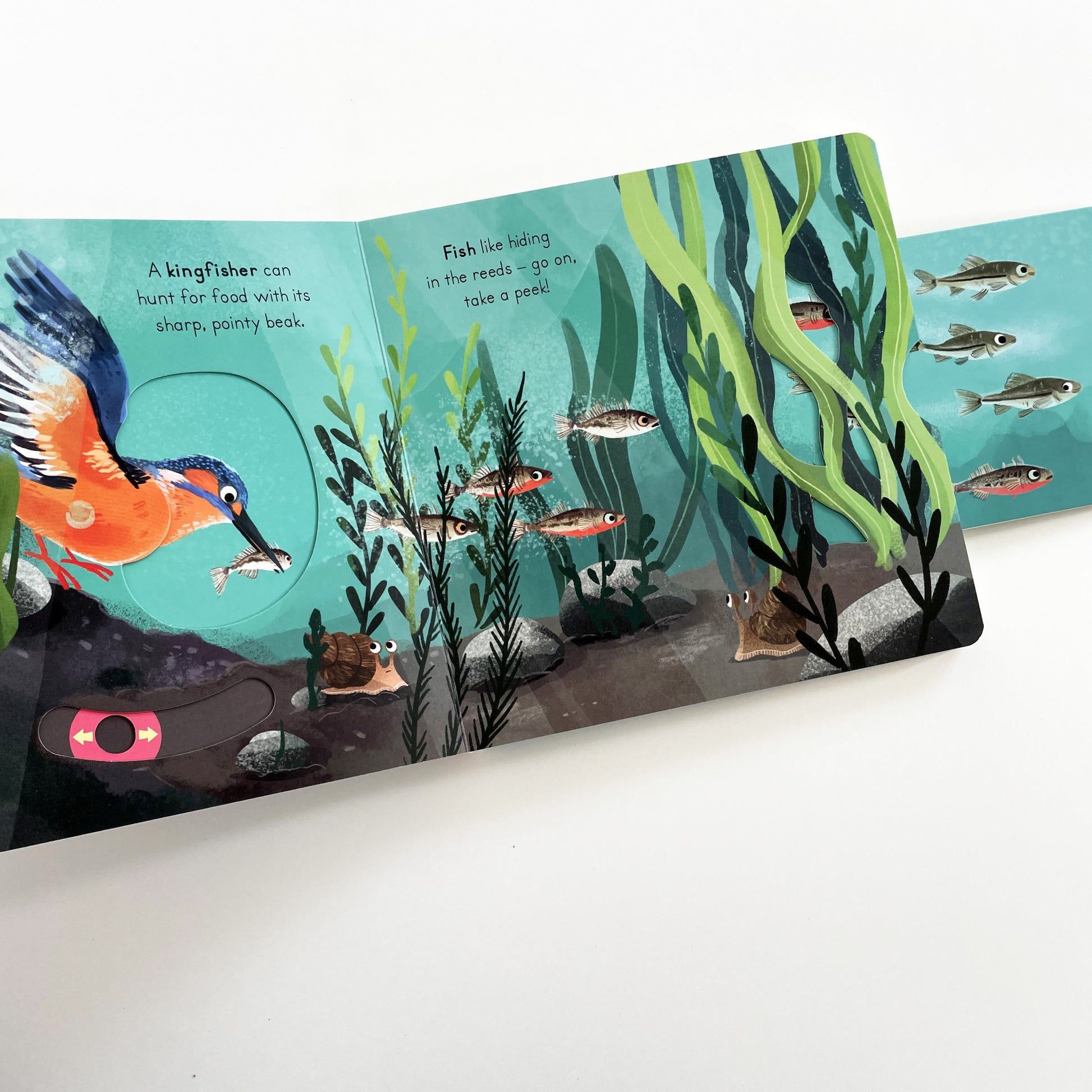 In this first river book, there are ducks floating on the river, beavers building dams, frogs catching insects and many more river creatures to bring to life with the moving parts.
