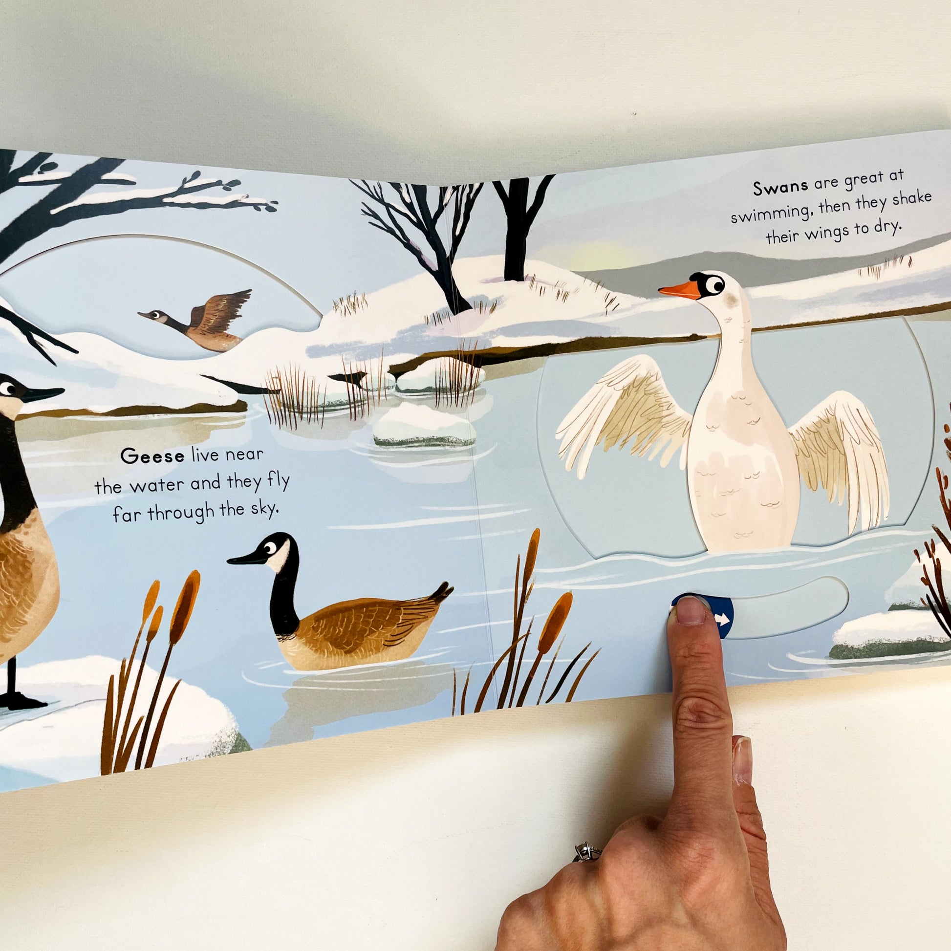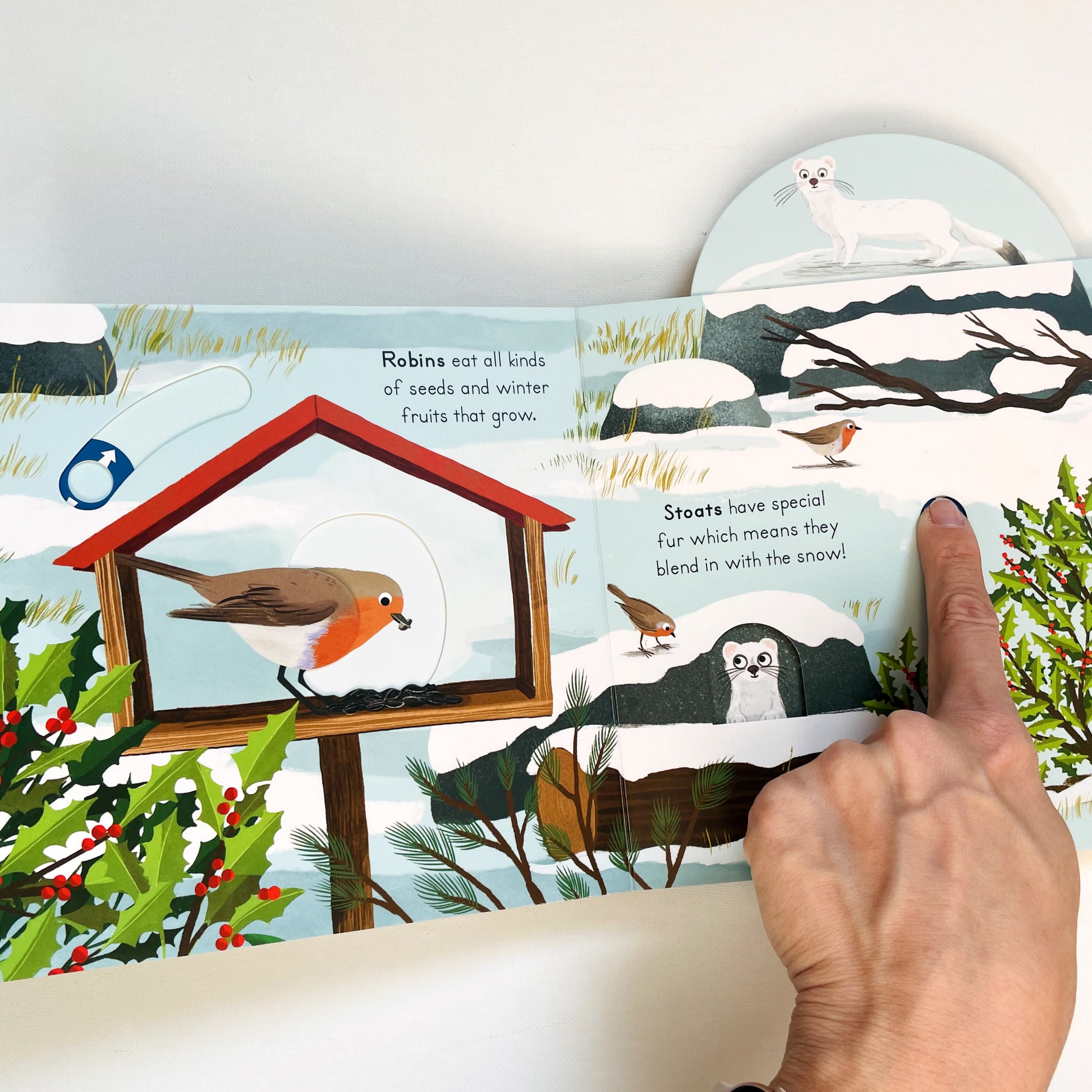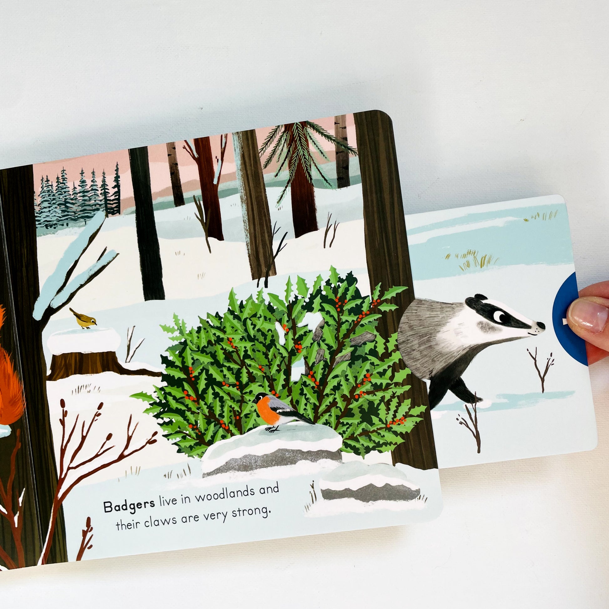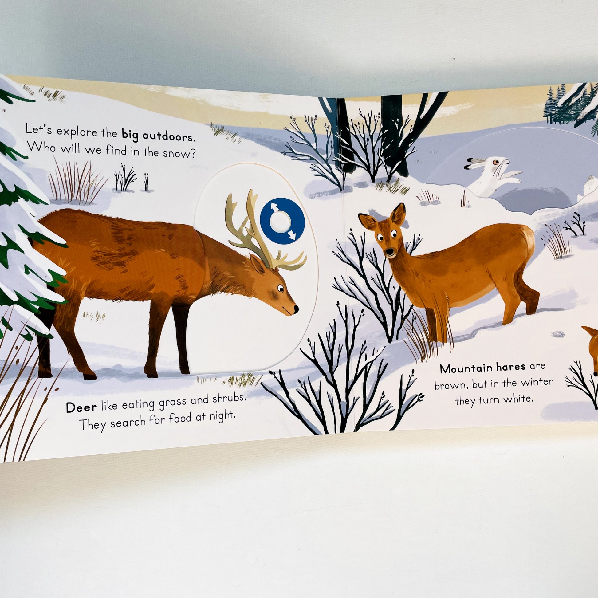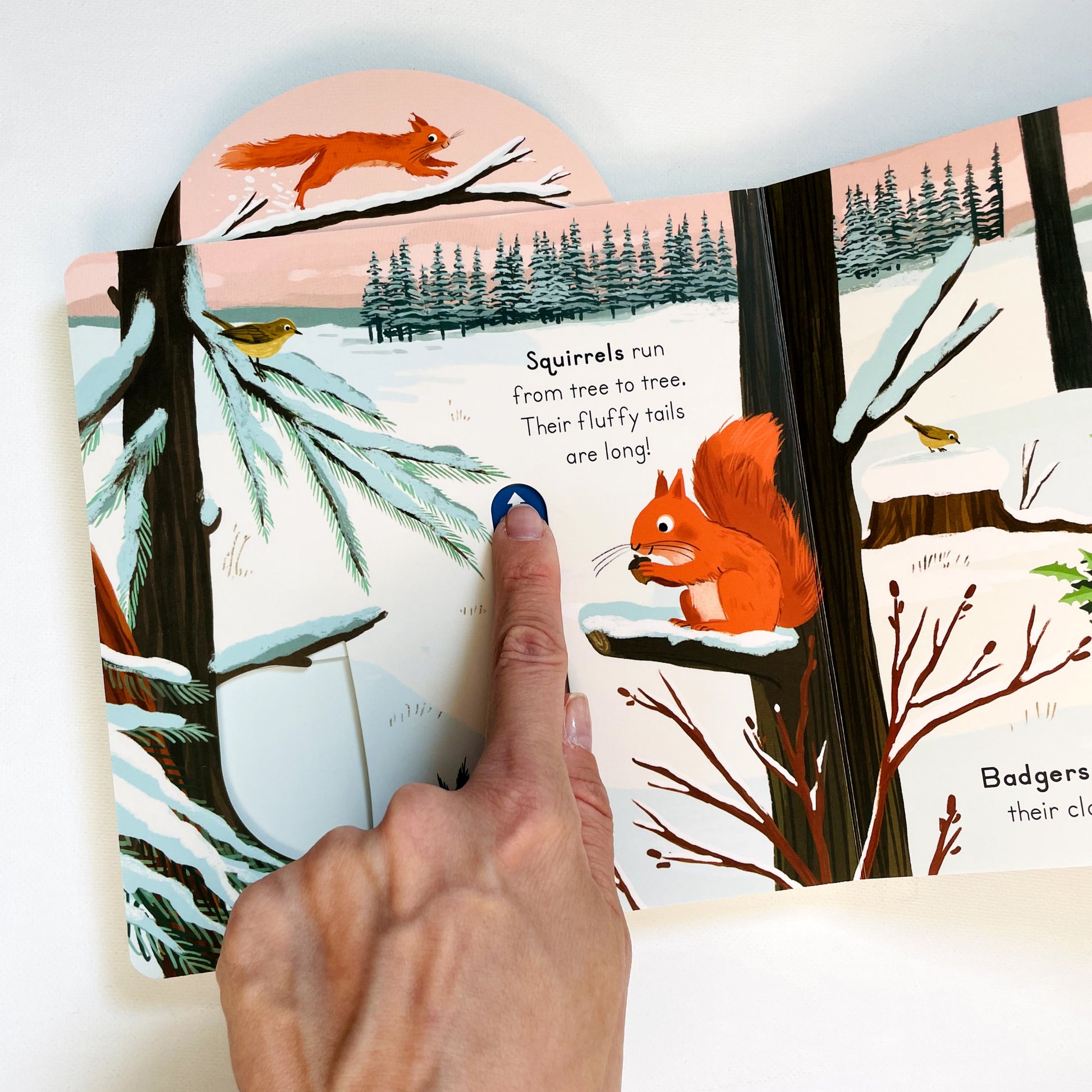 In this first snowy animals book, there are geese swimming on the frozen lake, hares bounding through the snow, squirrels scampering up frosty trees and many more creatures to bring to life with the moving parts..