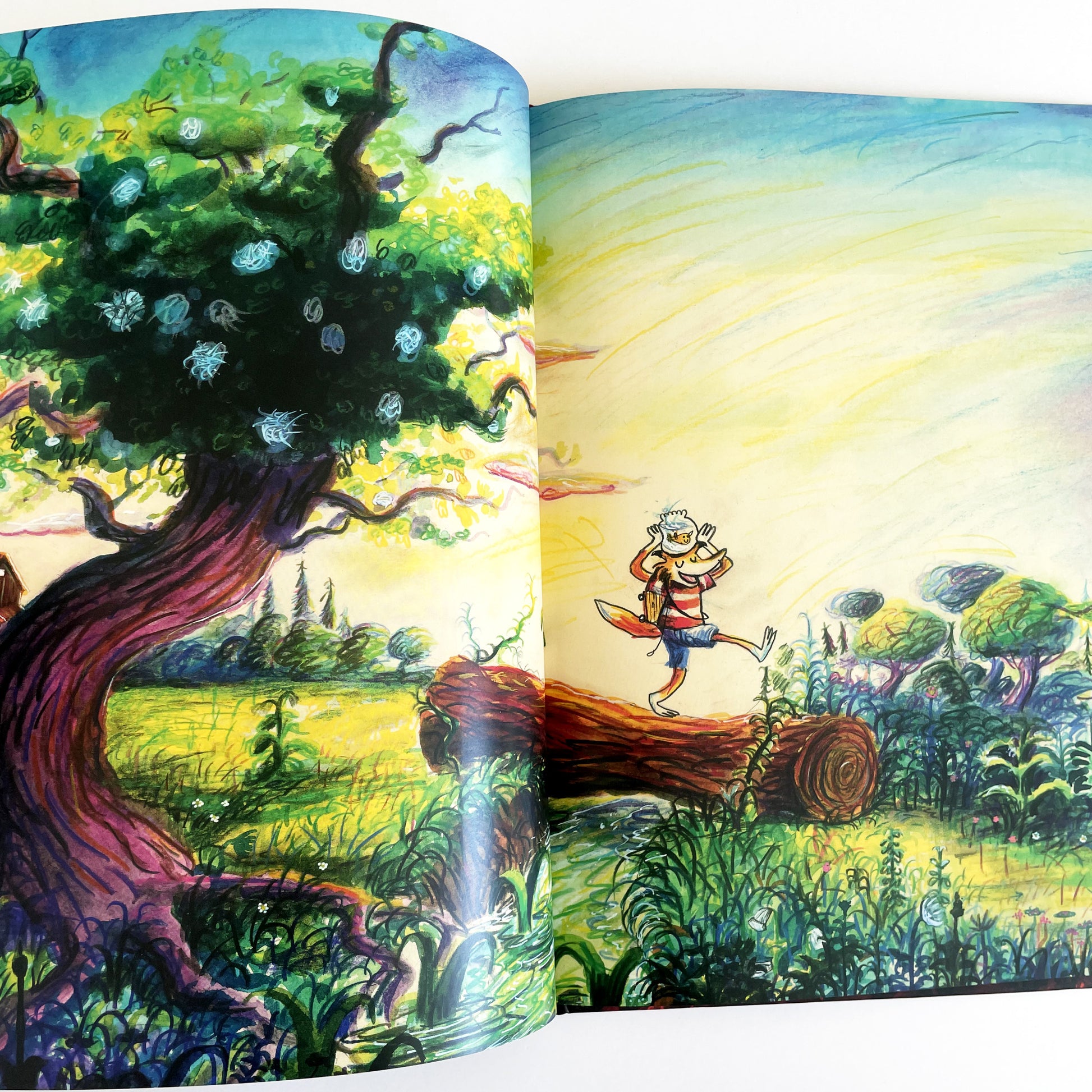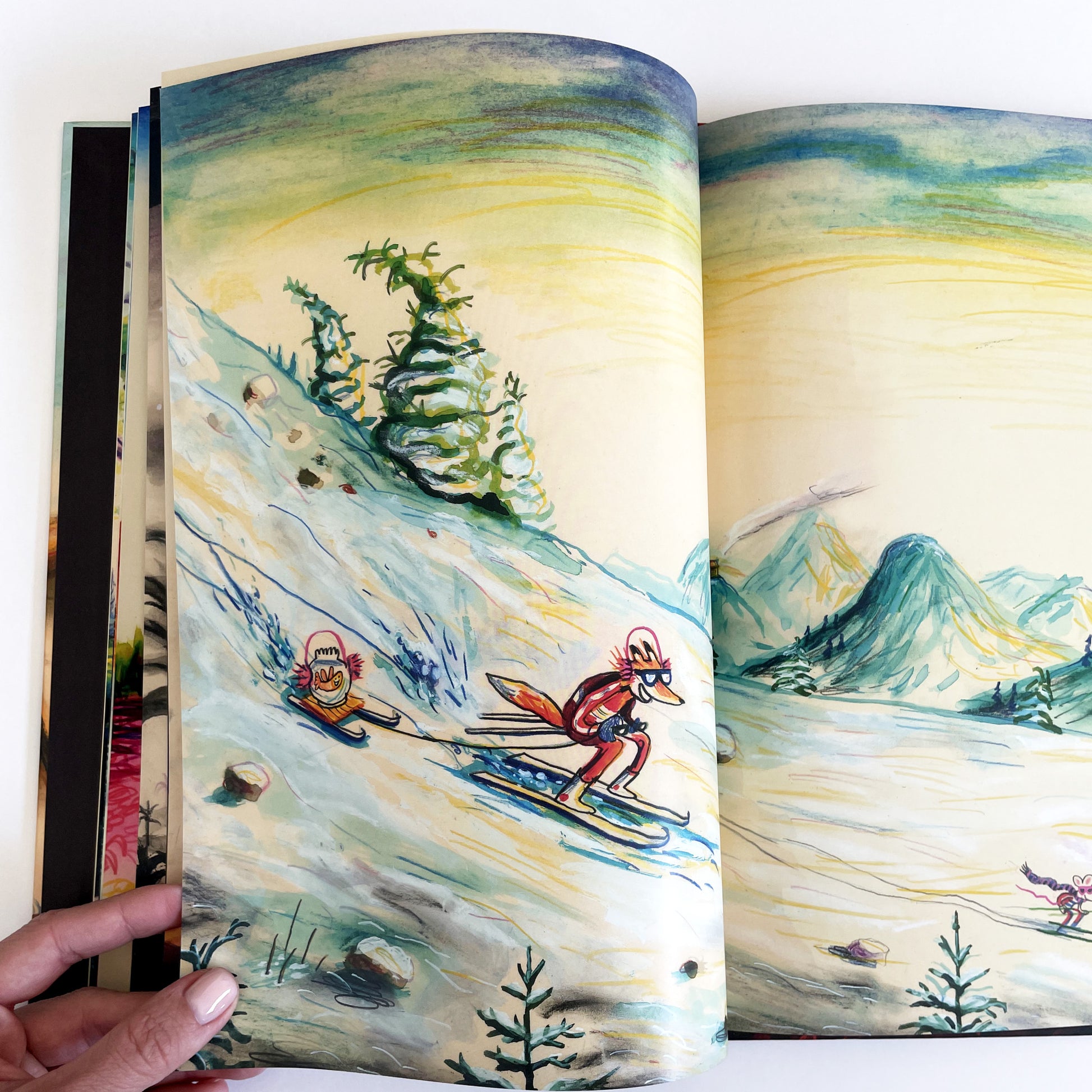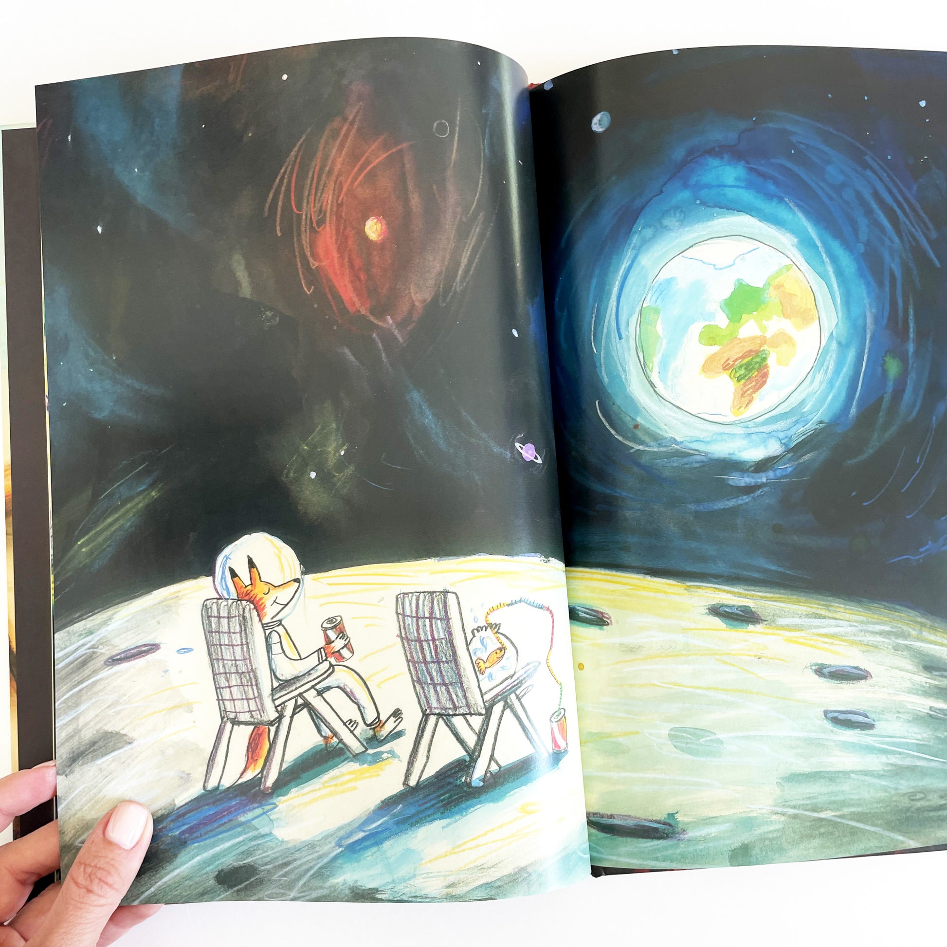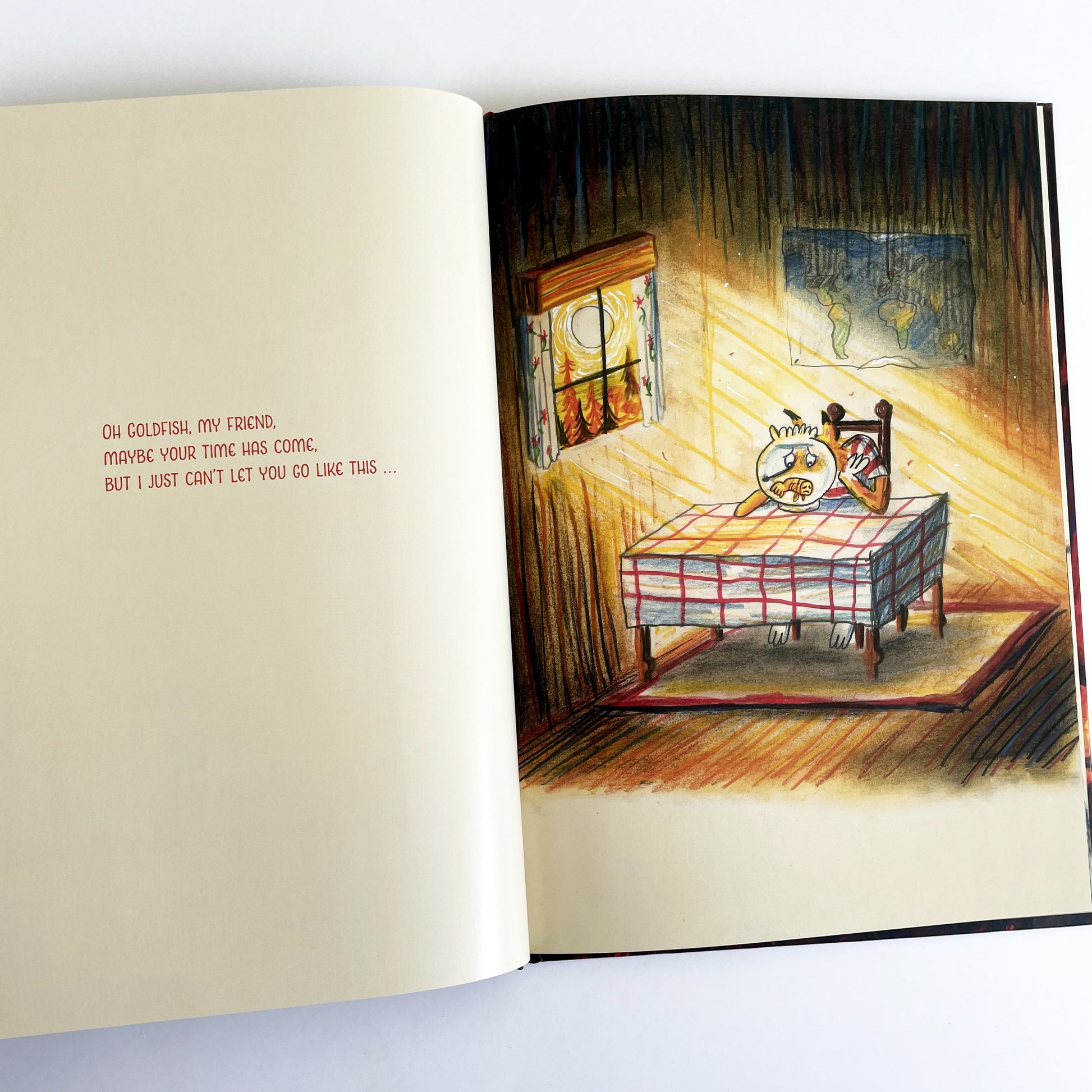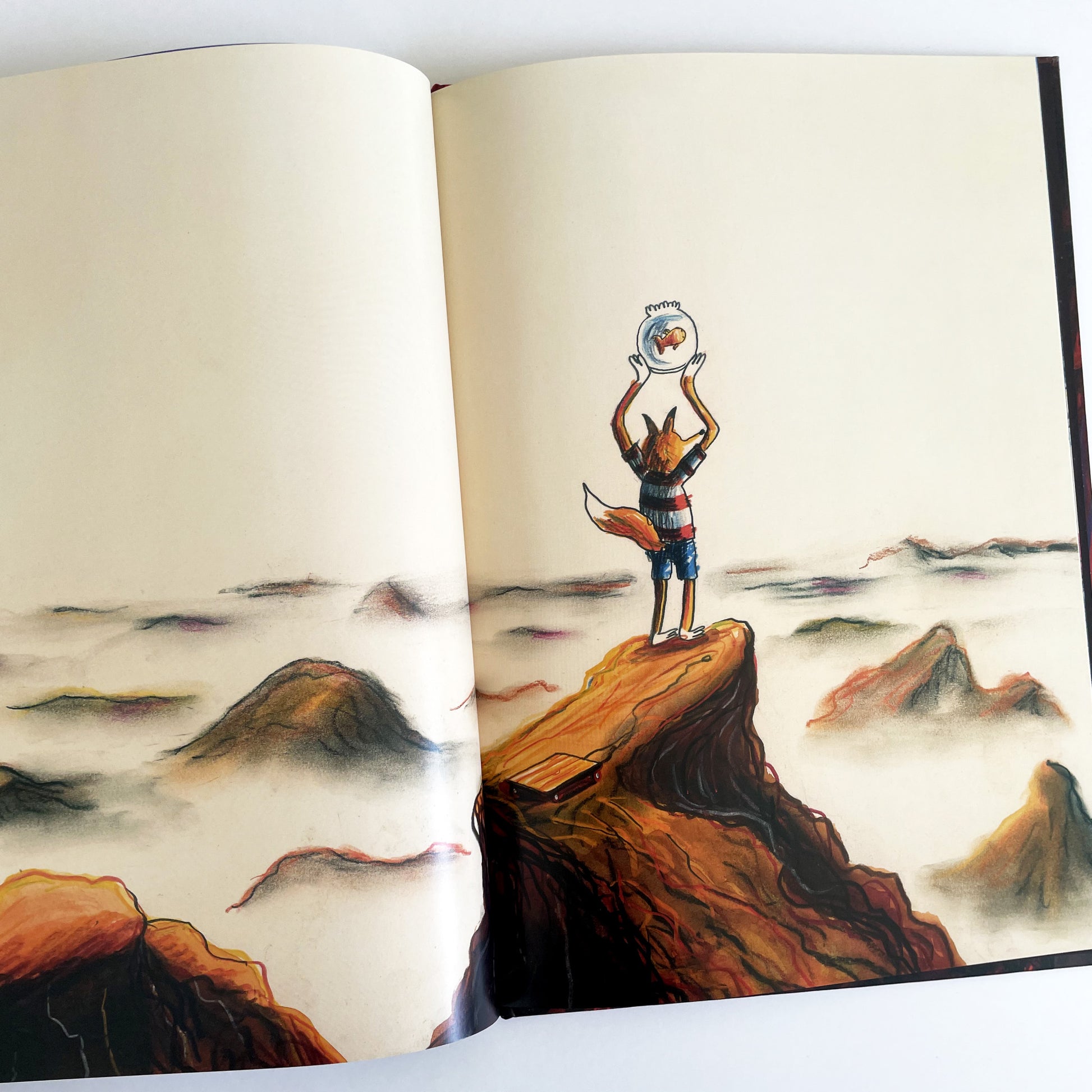 Fox knows that Goldfish is very unwell. Before it’s too late, he takes his friend on an epic adventure beyond the fishbowl. Together they take a splash in the ocean, go for a bike ride in the Grand Canyon, admire the view of Mount Fiji, explore the jungle, go skiing an d even make it to the moon. Then time has come for Fox to let go of Goldfish. At least he’s shown him the entire world.