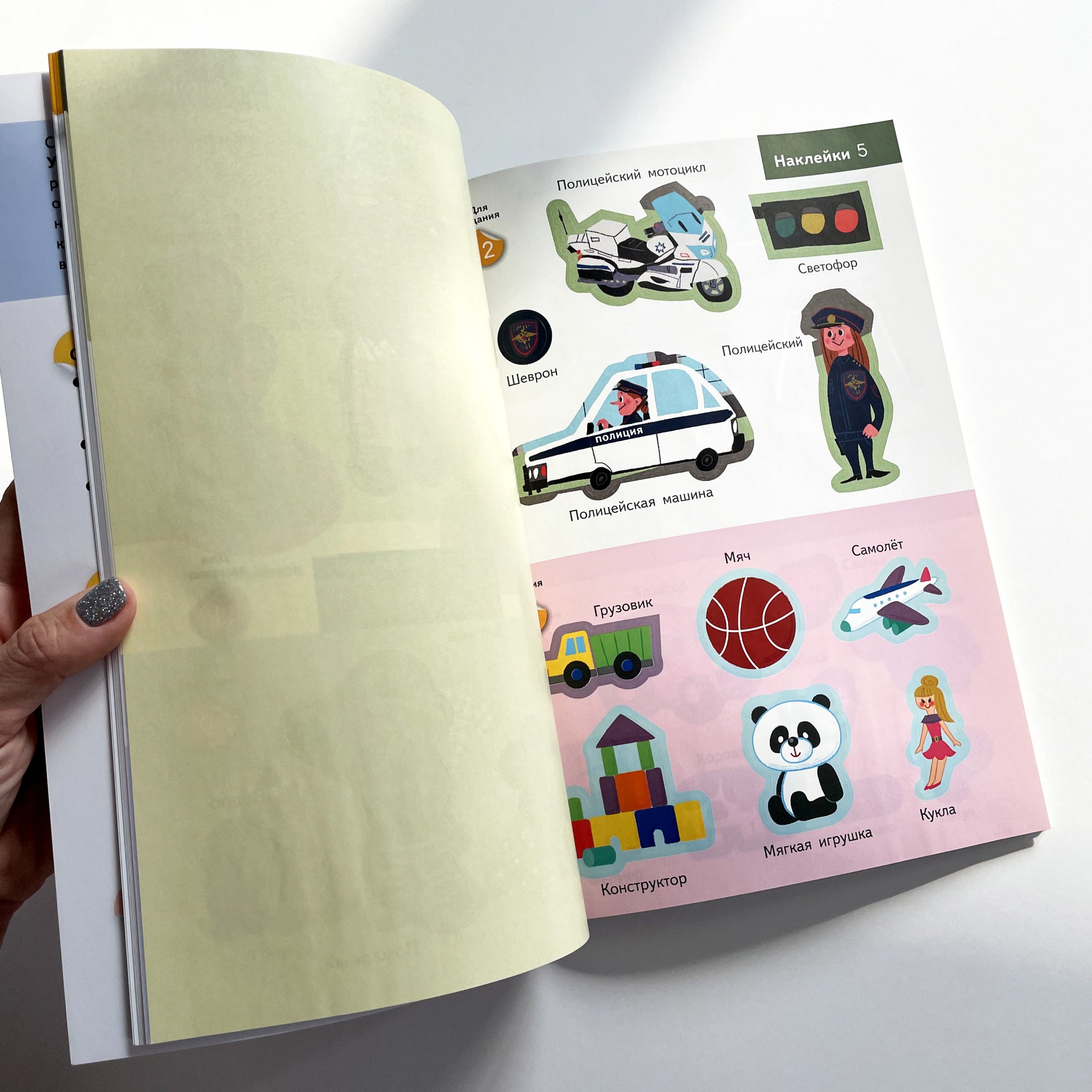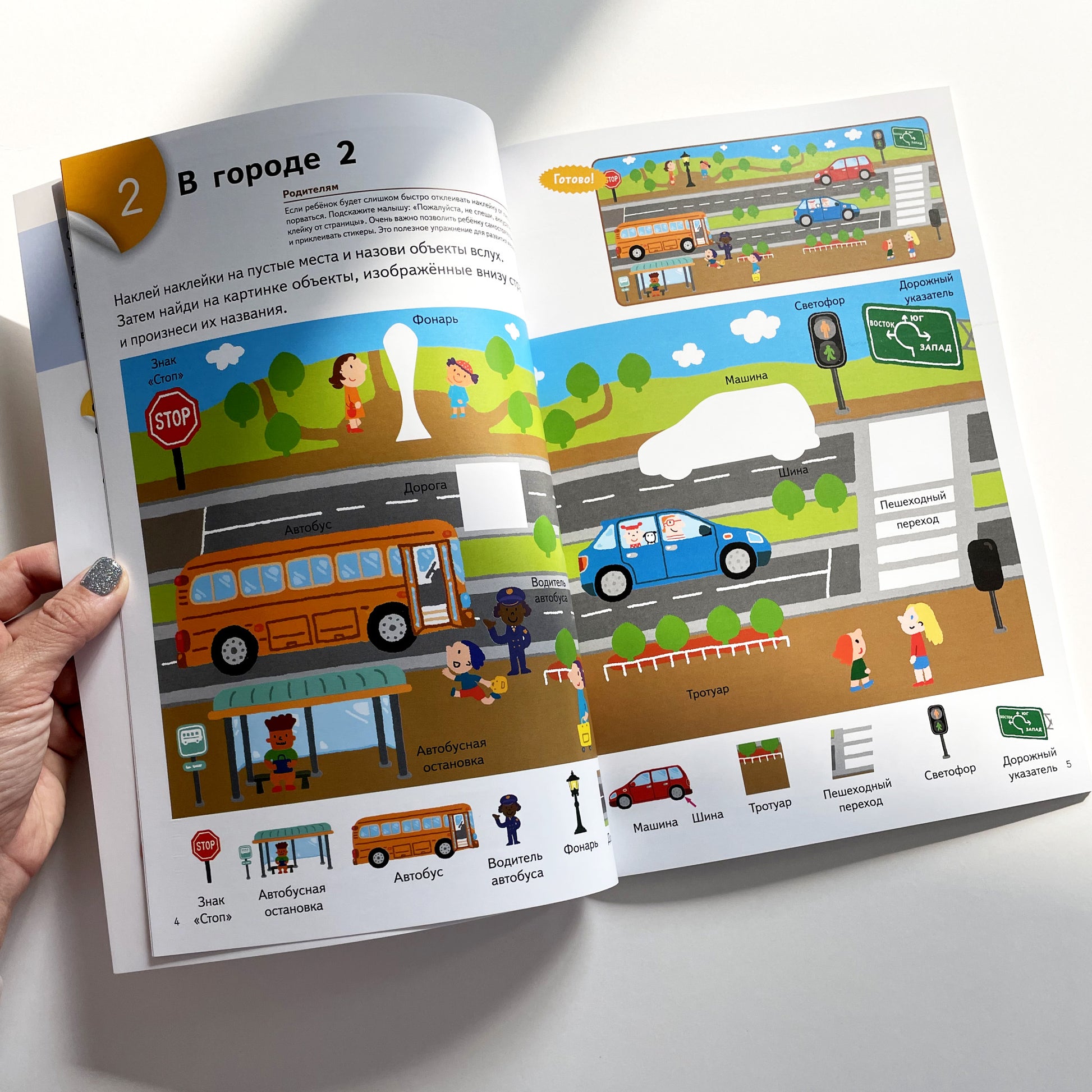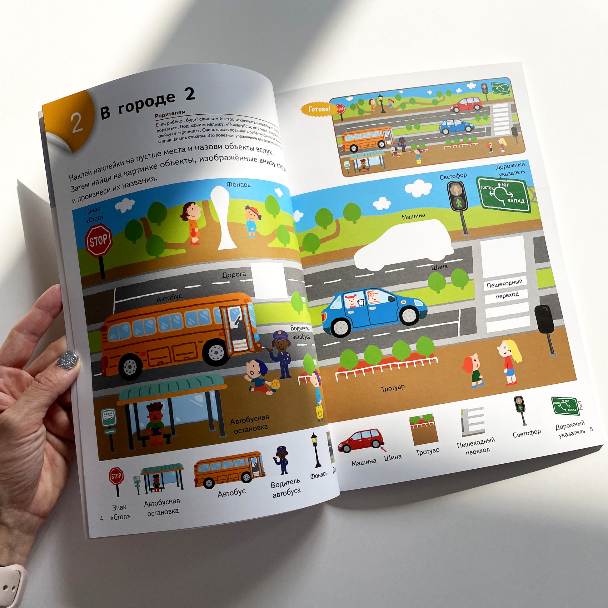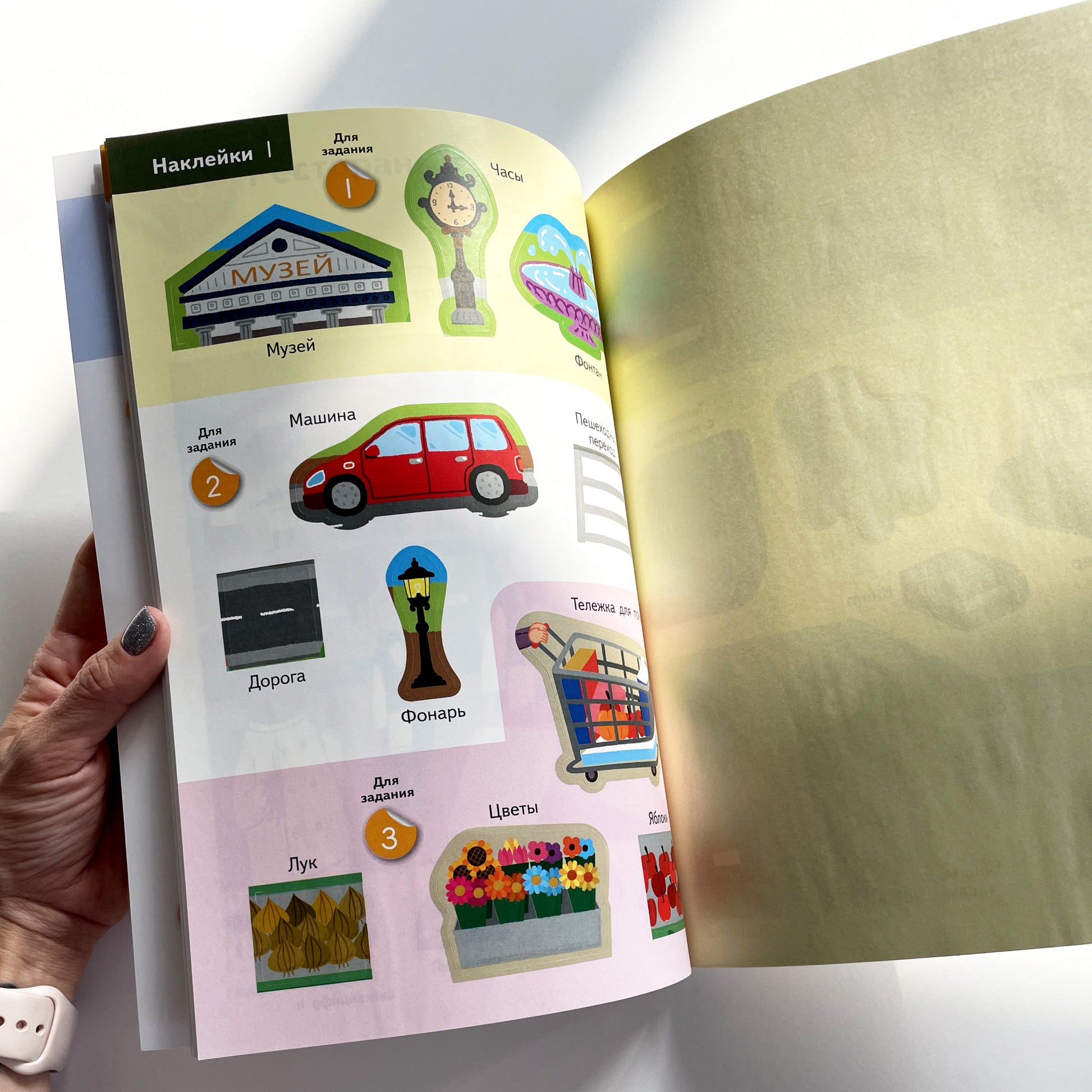 Выполняя весёлые упражнения в тетради, ребёнок запомнит названия объектов, которые окружают его в городе: почта, больница, полиция, пожарная часть, здания, кафе и так далее. Отделяя от листа и приклеивая на картинку стикеры разной формы и размера, малыш будет тренировать свои пальчики, и они станут ловкими и умелыми.